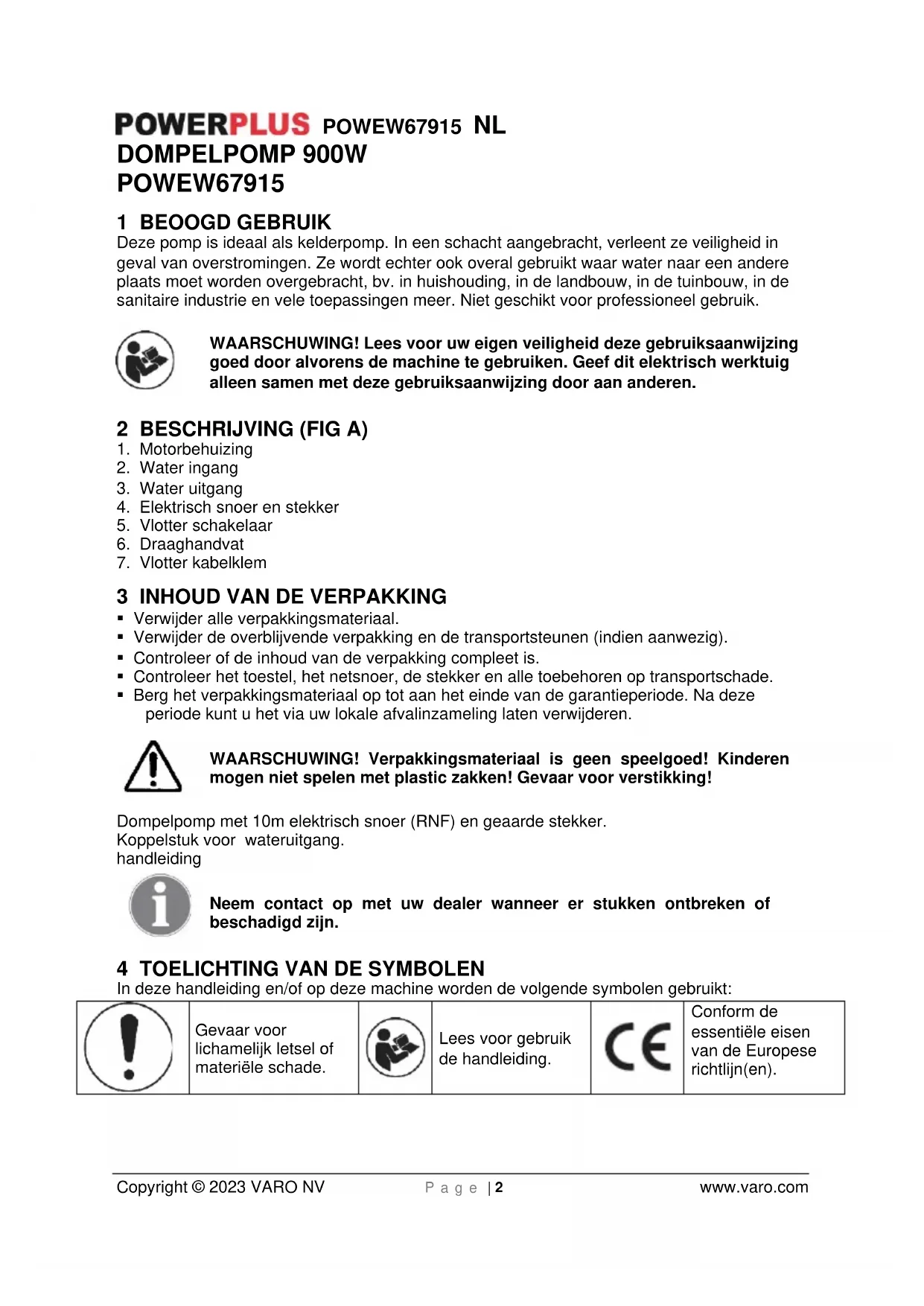 Copyright © 2023 VARO NV P a g e | 2 www.varo.com DOMPELPOMP 900W POWEW67915 1 BEOOGD GEBRUIK Deze pomp is ideaal als kelderpomp. In een schacht aangebracht, verleent ze veiligheid in geval van overstromingen. Ze wordt echter ook overal gebruikt waar water naar een andere plaats moet worden overgebracht, bv. in huishouding, in de landbouw, in de tuinbouw, in de sanitaire industrie en vele toepassingen meer. Niet geschikt voor professioneel gebruik. WAARSCHUWING! Lees voor uw eigen veiligheid deze gebruiksaanwijzing goed door alvorens de machine te gebruiken. Geef dit elektrisch werktuig alleen samen met deze gebruiksaanwijzing door aan anderen. 2 BESCHRIJVING (FIG A)