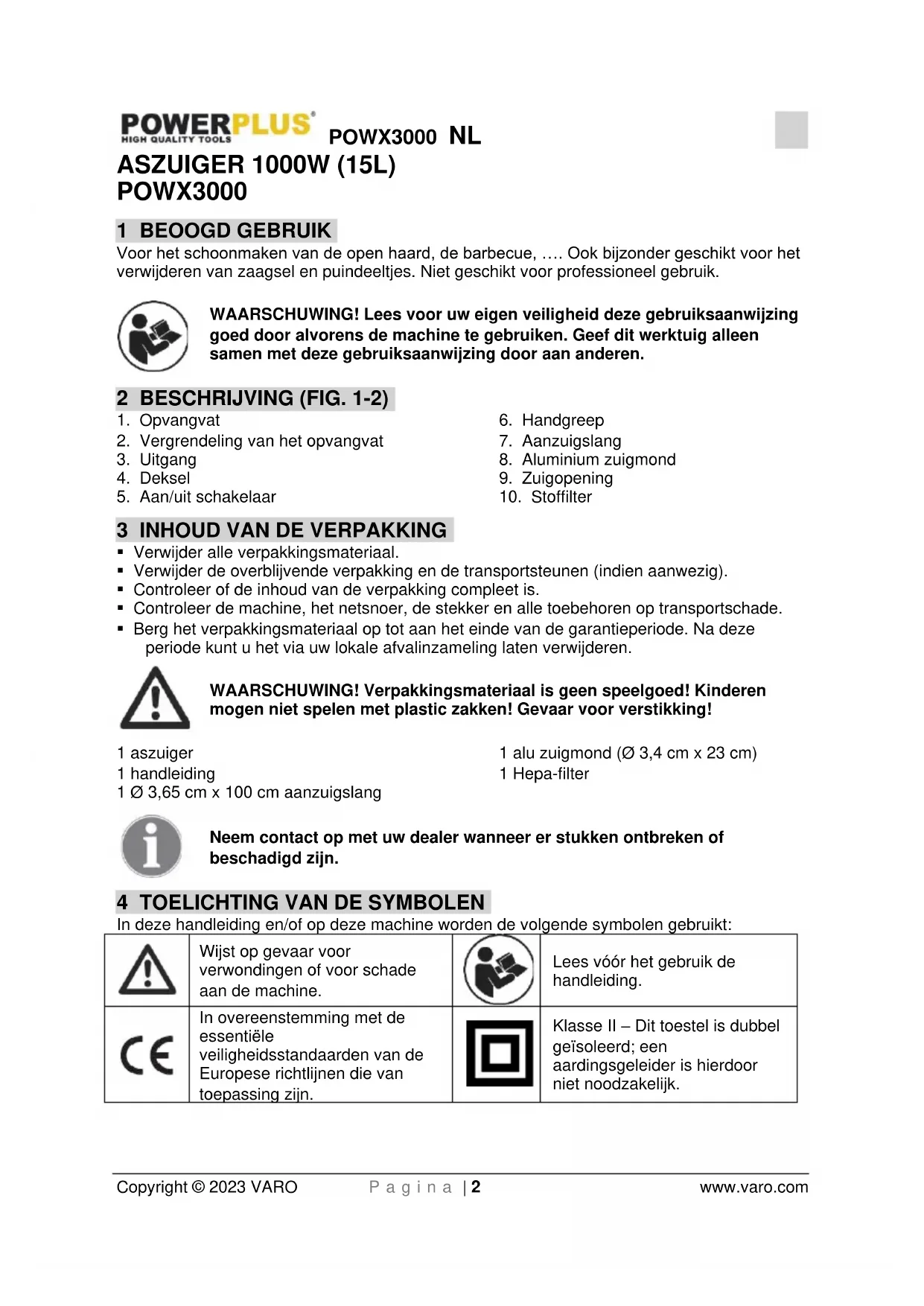 Copyright © 2023 VARO P a g i n a | 2 www.varo.com ASZUIGER 1000W (15L) POWX3000 1 BEOOGD GEBRUIK Voor het schoonmaken van de open haard, de barbecue, …. Ook bijzonder geschikt voor het verwijderen van zaagsel en puindeeltjes. Niet geschikt voor professioneel gebruik. WAARSCHUWING! Lees voor uw eigen veiligheid deze gebruiksaanwijzing goed door alvorens de machine te gebruiken. Geef dit werktuig alleen samen met deze gebruiksaanwijzing door aan anderen. 2 BESCHRIJVING (FIG. 1-2)