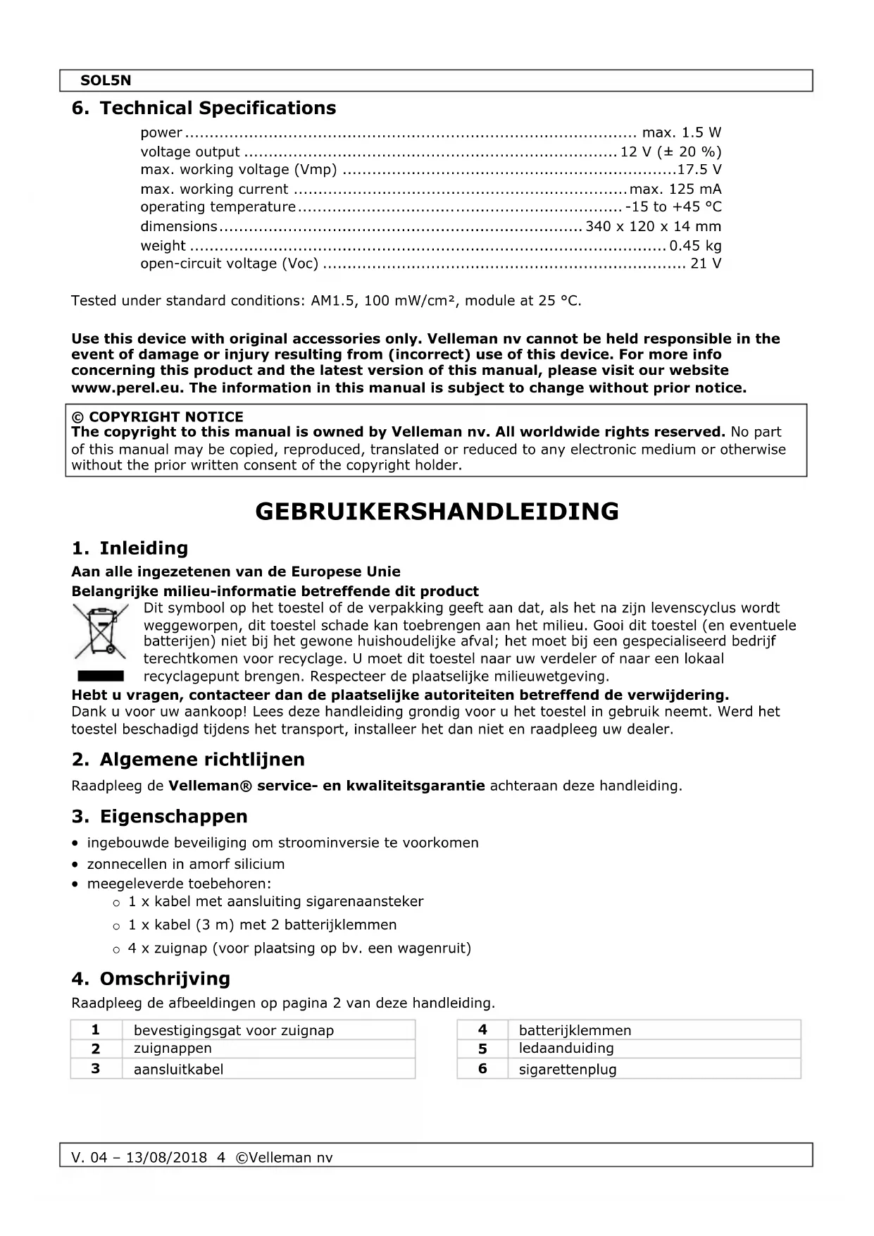 vermogen ...................................................................................... max. 1.5 W uitgangsspanning ........................................................................ 12 V (± 20 %) max. nominale spanning (Vmp) ................................................................17.5 V max. stroom ................................................................................. max. 125 mA werktemperatuur ........................................................................ -15 tot +45 °C afmetingen .......................................................................... 340 x 120 x 14 mm gewicht ................................................................................................ 0.45 kg nullastspanning (Voc) ................................................................................ 21 V Getest onder normale omstandigheden: AM1.5, 100 mW/cm², module aan 25 °C. Gebruik dit toestel enkel met originele accessoires. Velleman nv is niet aansprakelijk voor schade of kwetsuren bij (verkeerd) gebruik van dit toestel. Voor meer informatie over dit product en de laatste versie van deze handleiding, zie www.perel.eu. De informatie in deze handleiding kan te allen tijde worden gewijzigd zonder voorafgaande kennisgeving. © AUTEURSRECHT Velleman nv heeft het auteursrecht voor deze handleiding. Alle wereldwijde rechten voorbehouden. Het is niet toegestaan om deze handleiding of gedeelten ervan over te nemen, te kopiëren, te vertalen, te bewerken en op te slaan op een elektronisch medium zonder voorafgaande schriftelijke toestemming van de rechthebbende.SOL5N