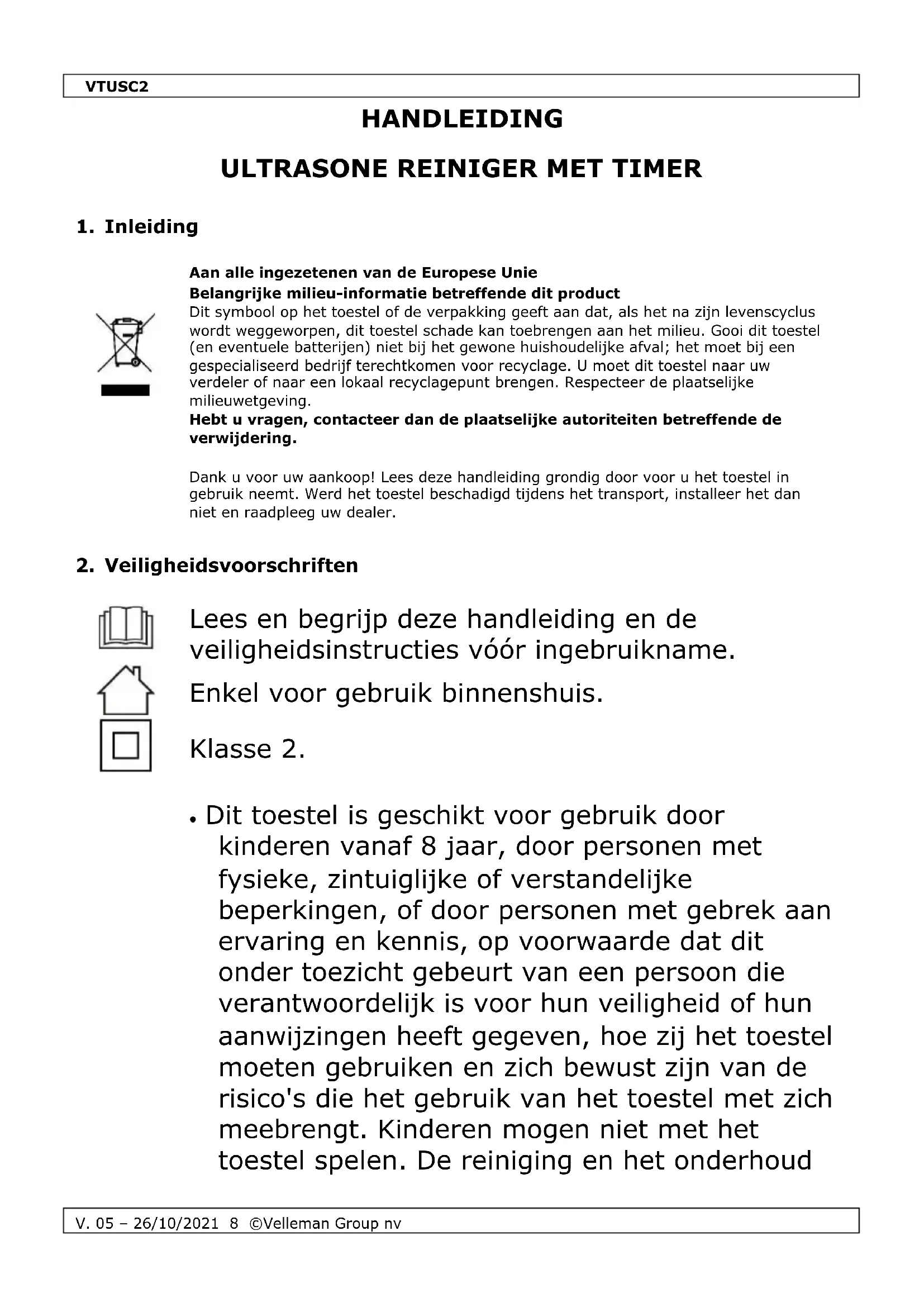 - Dit toestel is geschikt voor gebruik door kinderen vanaf 8 jaar, door personen met fysieke, zintuiglijke of verstandelijke beperkingen, of door personen met gebrek aan ervaring en kennis, op voorwaarde dat dit onder toezicht gebeurt van een persoon die verantwoordelijk is voor hun veiligheid of hun aanwijzingen heeft gegeven, hoe zij het toestel moeten gebruiken en zich bewust zijn van de risico's die het gebruik van het toestel met zich meebrengt. Kinderen mogen niet met het toestel spelen. De reiniging en het onderhoudVTUSC2