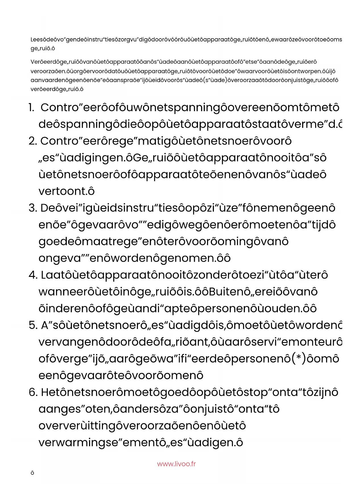 @Livoowww.livoo.fr Lees de volgende instructies zorgvuldig door vóór u het apparaat gebruikt en bewaar ze voor toekomstig gebruik. Verkeerd gebruik van het apparaat kan schade aan het apparaat of letsel aan de gebruiker veroorzaken. Zorg ervoor dat u het apparaat gebruikt voor het doel waarvoor het is ontworpen. Wij aanvaarden geen enkele aansprakelijkheid voor schade (schade) veroorzaakt door onjuist gebruik of verkeerd gebruik.