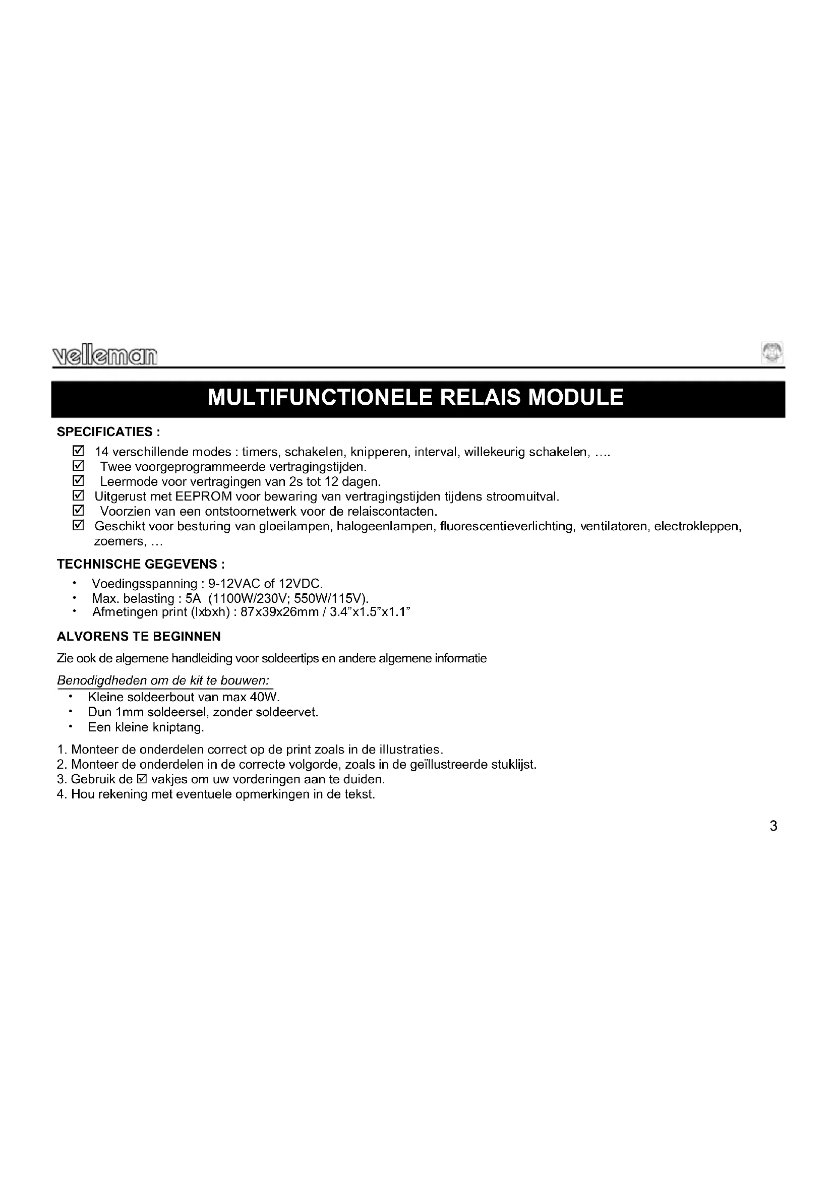 Legen Heirweg 33 9890 Gavere Belgium Europe www.velleman.be www.velleman-kit.com3 SPECIFICATIES : 14 verschillende modes : timers, schakelen, knipperen, interval, willekeurig schakelen, …. Twee voorgeprogrammeerde vertragingstijden. Leermode voor vertragingen van 2s tot 12 dagen. Uitgerust met EEPROM voor bewaring van vertragingstijden tijdens stroomuitval. Voorzien van een ontstoornetwerk voor de relaiscontacten. Geschikt voor besturing van gloeilampen, halogeenlampen, fluorescentieverlichting, ventilatoren, electrokleppen, zoemers, … TECHNISCHE GEGEVENS : Voedingsspanning : 9-12VAC of 12VDC. Max. belasting : 5A (1100W/230V; 550W/115V). Afmetingen print (lxbxh) : 87x39x26mm / 3.4”x1.5”x1.1”
