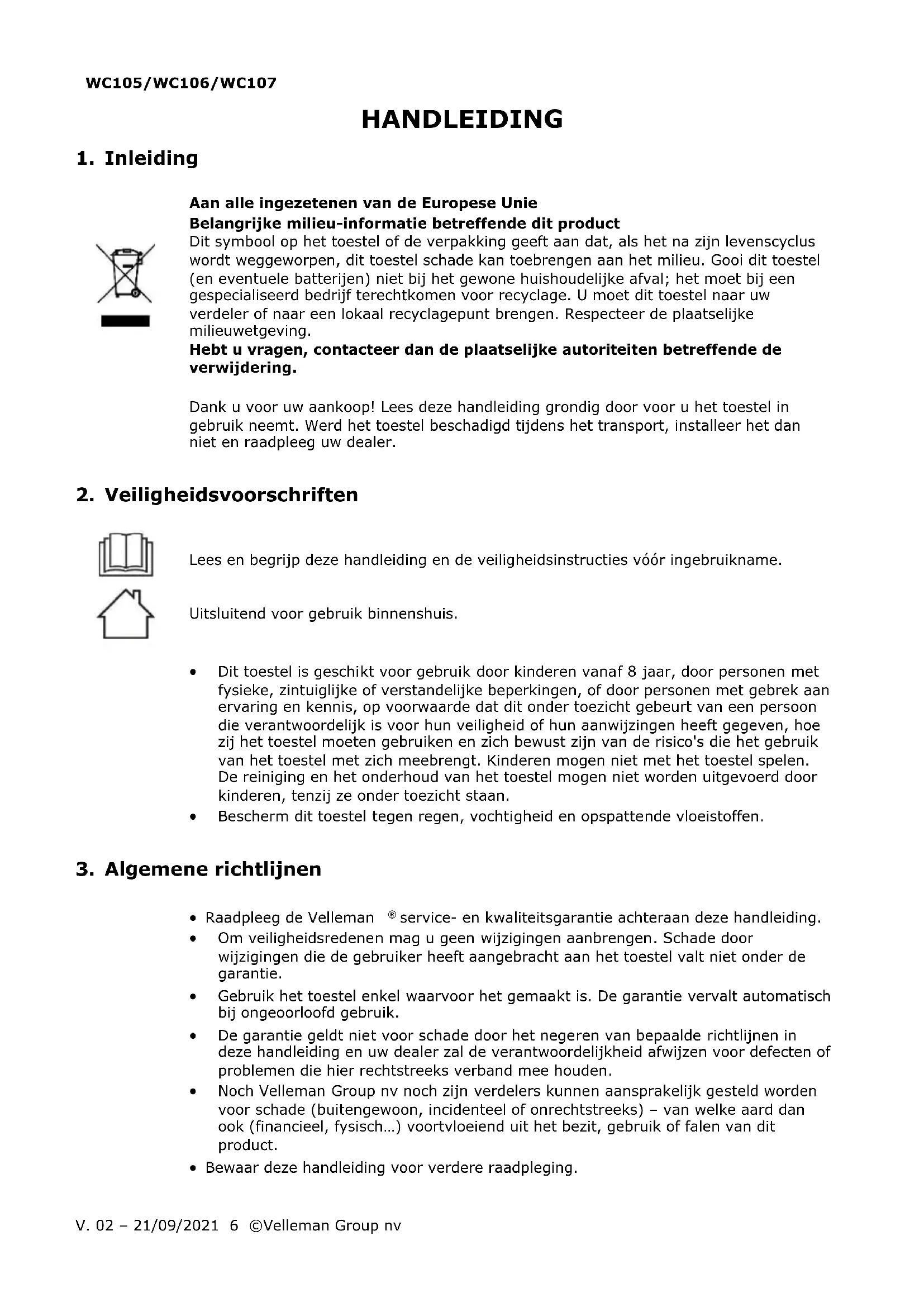 Velleman Group nv heeft het auteursrecht voor deze handleiding. Alle wereldwijde rechten voorbehouden. Het is niet toegestaan om deze handleiding of gedeelten ervan over te nemen, te kopiëren, te vertalen, te bewerken en op te slaan op een elektronisch medium zonder voorafgaande schriftelijke toestemming van de rechthebbende.WC105/WC106/WC107