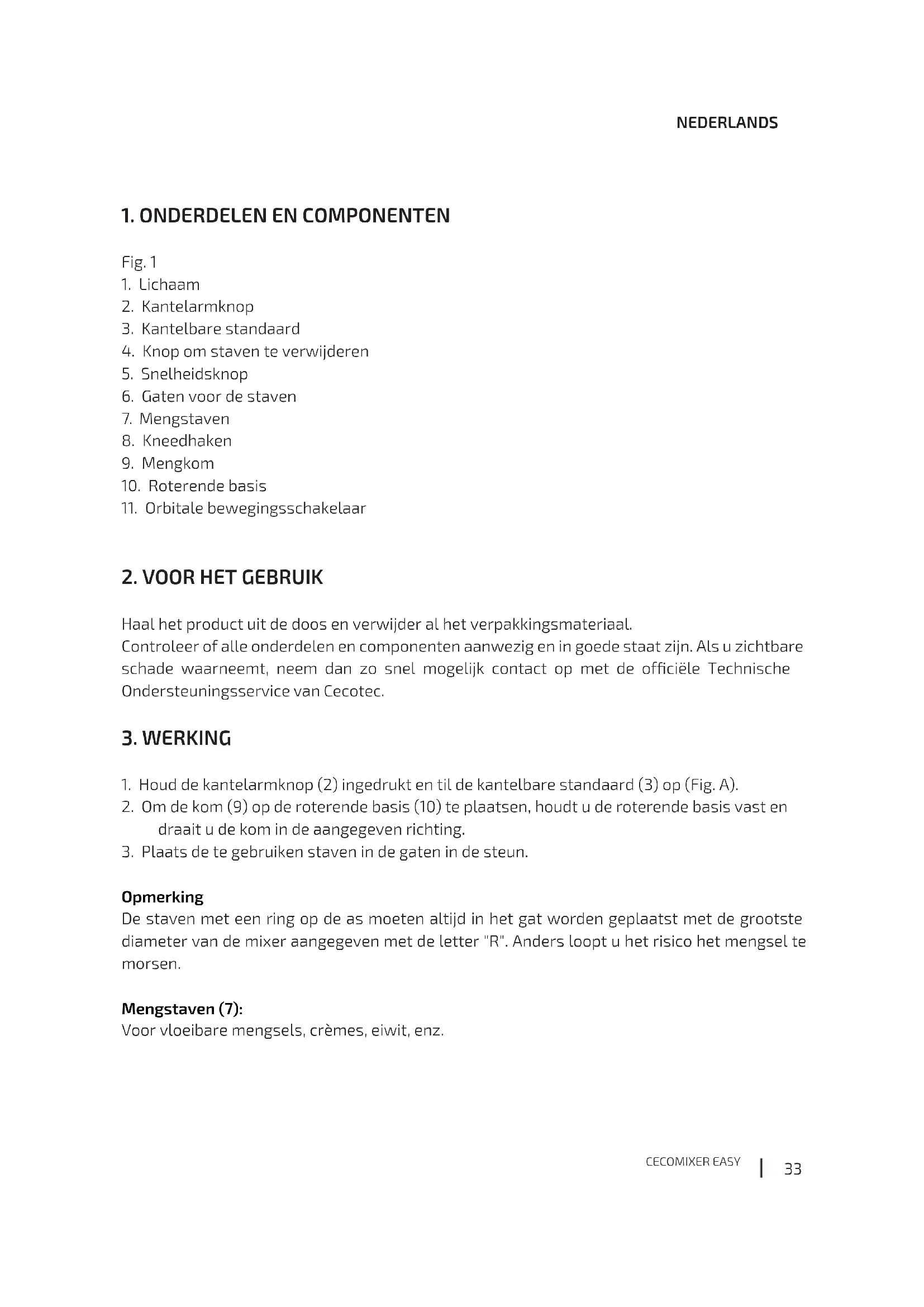 Opmerking De staven met een ring op de as moeten altijd in het gat worden geplaatst met de grootste diameter van de mixer aangegeven met de letter "R". Anders loopt u het risico het mengsel te morsen. Mengstaven (7): Voor vloeibare mengsels, crèmes, eiwit, enz.CECOMIXER EASY