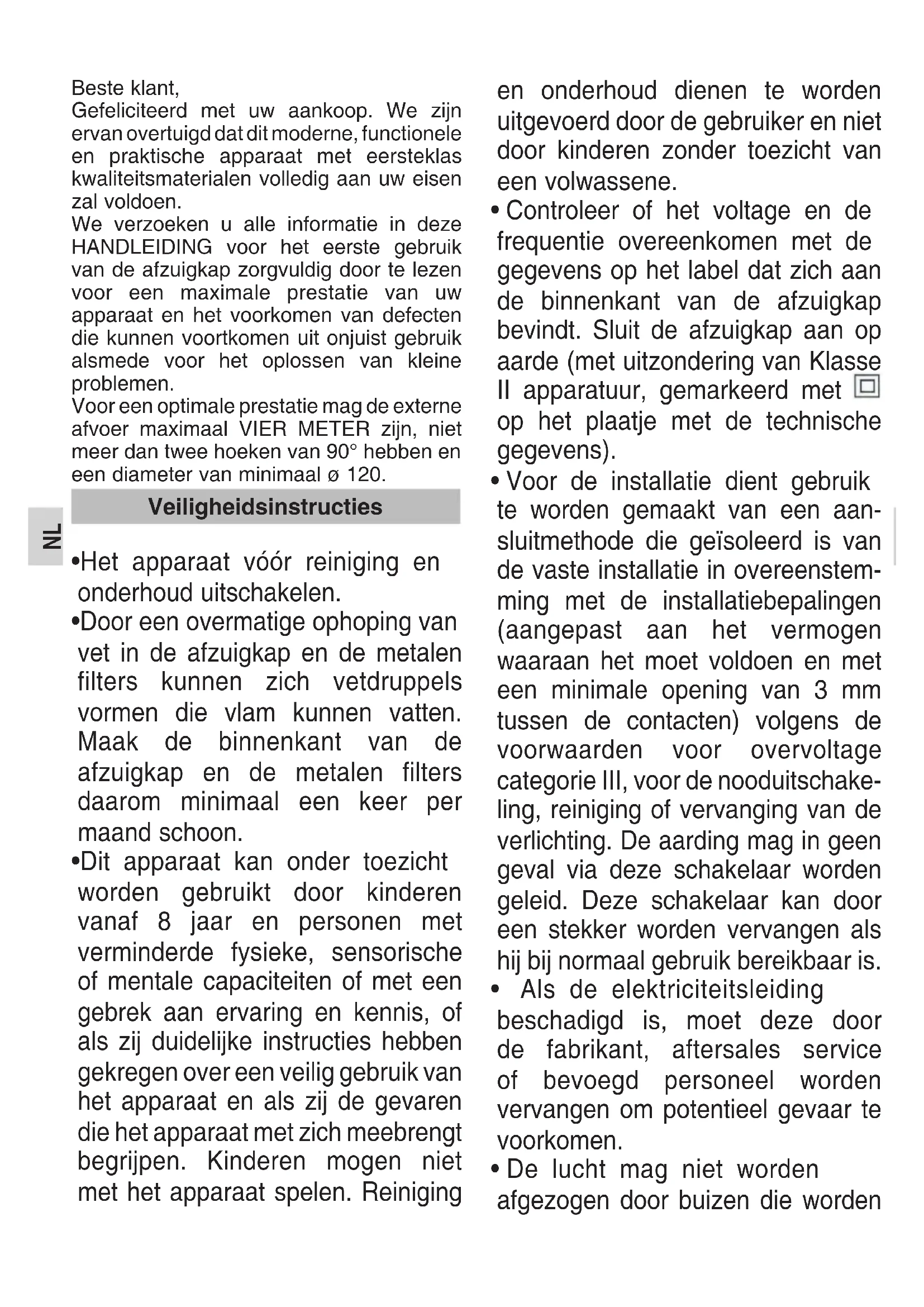 - De lucht mag niet worden afgezogen door buizen die worden VeiligheidsinstructiesNL gebruikt voor het verwijderen van dampen van apparatuur die door gas of andere brandstoffen wordt gevoed.