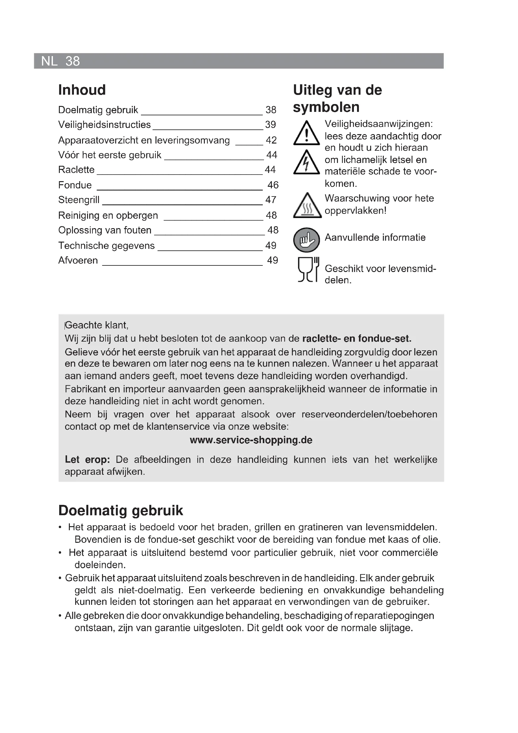 - Alle gebreken die door onvakkundige behandeling, beschadiging of reparatiepogingen ontstaan, zijn van garantie uitgesloten. Dit geldt ook voor de normale slijtage. Inhoud Doelmatig gebruik ______________________ 38 Veiligheidsinstructies ____________________ 39 Apparaatoverzicht en leveringsomvang _____ 42 Vóór het eerste gebruik __________________ 44 Raclette ______________________________ 44 Fondue ______________________________ 46 Steengrill _____________________________ 47 Reiniging en opbergen __________________ 48 Oplossing van fouten ____________________ 48 Technische gegevens ___________________ 49 Afvoeren _____________________________ 49 Uitleg van de symbolen Veiligheidsaanwijzingen: lees deze aandachtig door en houdt u zich hieraan om lichamelijk letsel en materiële schade te voor- komen. Waarschuwing voor hete oppervlakken! Aanvullende informatie Geschikt voor levensmid- delen.39 NL Veiligheidsinstructies ■ Dit apparaat kan worden gebruikt door kinderen vanaf 8 jaar en door personen met beperkte lichamelijke, sensorische of geestelijke vermogens of kinderen die niet beschikken over ervaring en/of kennis, wanneer zij onder toezicht staan en instructies hebben gekregen over hoe het apparaat op veilige wijze kan worden gebruikt en wanneer zij de daaruit voortvloeiende gevaren hebben begrepen. ■ Kinderen mogen niet met het apparaat spelen. ■ Reiniging en gebruikersonderhoud mogen niet worden uitgevoerd door kinderen, tenzij zij ouder zijn dan 8 jaar en onder toezicht staan. ■ Kinderen jonger dan 8 jaar en dieren moeten uit de buurt worden gehouden van het apparaat en het netsnoer. Waarschuwing voor hete oppervlakken! Het apparaat wordt tijdens het gebruik erg heet. Let er beslist op dat u tijdens en na het gebruik van het apparaat niet in aanraking komt met opgewarmde delen. Raak uitsluitend de grepen en de temperatuurregelaar aan, wanneer het apparaat in bedrijf is of direct na het uitschakelen. Voor de hantering van het apparaat raden wij aan om keukenhandschoenen te gebruiken. ■ Wanneer het apparaat niet onder toezicht staat, en vóór het monteren, demonteren of reinigen moet het altijd van het stroomnet worden geïsoleerd. ■ Breng geen veranderingen aan het apparaat aan. Verwissel ook niet zelf het netsnoer. Wanneer het apparaat, het netsnoer of de stekker van het apparaat is beschadigd, dan moeten deze door de fabrikant of klantenservice of een soortgelijk gekwalifi ceerde persoon (bijv. gespecialiseerde werkplaats) worden vervangen, om gevaren te voorkomen. ■ Het apparaat is niet bedoeld om te worden gebruikt in combinatie met een externe tijdschakelaar of een apart afstandsbedieningssysteem. ■ OPGELET: reinigingsinstructies opvolgen in het hoofdstuk “Reinigen en opbergen”!NL 40 Gevaar voor verwondingen ■ Houd kinderen en dieren uit de buurt van het apparaat en het verpakkingsmateriaal. Er bestaat verwondings- en verstikkingsgevaar. ■ OPGELET Verbrandingsgevaar! Wees voorzichtig bij de omgang met hete olie of hete kaas in de fonduepan! Giet nooit heet water in hete olie of water in andere vetstoffen! ■ Let erop, dat de fonduepan resp. de steengrill correct in de daarvoor bedoelde uitsparing in de racletteplaat ligt. ■ Let erop dat niemand kan struikelen over het aangesloten netsnoer. Het snoer mag niet naar beneden hangen vanaf de plaats waar het apparaat is geplaatst, om te voorkomen dat het apparaat naar beneden wordt getrokken. ■ Laat het apparaat altijd volledig afkoelen voordat u het reinigt en / of opbergt. Gevaar voor elektrische schokken en brand ■ Gebruik het apparaat uitsluitend binnenshuis. ■ Plaats het apparaat altijd met voldoende vrije ruimte naar alle kanten en vrije ruimte naar boven, om een hittestuwing te voorkomen. ■ Sluit het apparaat alleen aan op een contactdoos met aardingscontacten die is geïnstalleerd volgens de voorschriften. De contactdoos moet ook na het aansluiten goed toegankelijk zijn, zodat de verbinding op het stroomnet snel kan worden ontkoppeld. De netspanning moet overeenstemmen met de technische gegevens van het apparaat. Gebruik alleen correct werkende verlengsnoeren, waarvan de technische gegevens overeenstemmen met die van het apparaat. ■ Dompel het apparaat, het netsnoer en de stekker nooit in water of andere vloeistoffen en zorg ervoor dat deze niet in het water kunnen vallen of nat kunnen worden. ■ Mocht het apparaat in het water vallen, onderbreekt u meteen de stroomtoevoer. Probeer niet om het uit het water te trekken, wanneer het is aangesloten op het stroomnet! ■ Gebruik het apparaat niet wanneer het niet goed functioneert, in het water of naar beneden is gevallen. Laat het vóór ingebruikneming controleren in een gespecialiseerde werkplaats. ■ Raak het apparaat, het netsnoer en de stekker nooit aan met vochtige handen wanneer deze onderdelen zijn aangesloten op het stroomnet. ■ Schakel het apparaat uit en trek de netstekker uit de contactdoos, wanneer tijdens het gebruik een storing optreedt of vóór een onweersbui. ■ Trek altijd aan de stekker en nooit aan het netsnoer. ■ Plaats altijd eerst de houder voor de fonduepan in de raclette-grillplaat, voordat u de fonduepan op de raclette-grillplaat plaatst (zie hoofdstuk “Raclette” en “Fondue”). Zonder de houder kan een veilige stand van de pan niet worden gegarandeerd. ■ Gebruik het apparaat niet in ruimten, waarin zich licht ontvlambaar stof of giftige alsook explosieve dampen bevinden. ■ Gebruik het apparaat niet in een zeer vochtige omgeving of in de buurt van brand- baar materiaal. ■ Dek het apparaat tijdens de werking niet af, om ontbranden van het apparaat te voorkomen. Zorg voor voldoende ventilatie, wanneer het apparaat in bedrijf is.41 NL ■ Gebruik voor de fondue alleen vetten en oliën, die geschikt zijn om mee te frituren. ■ OPGELET Brandgevaar! Let erop, dat olie- en vethoudende etenswaren niet te sterk worden verhit, zodat deze niet vlam vatten. ■ Bij brand: – Trek onmiddellijk de netst