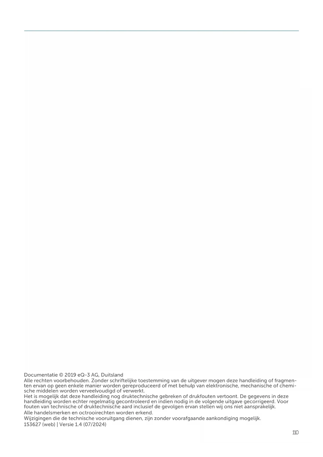 - 16 Technische gegevens 10 Documentatie © 2019 eQ-3 AG, Duitsland Alle rechten voorbehouden. Zonder schriftelijke toestemming van de uitgever mogen deze handleiding of fragmen- ten ervan op geen enkele manier worden gereproduceerd of met behulp van elektronische, mechanische of chemi- sche middelen worden verveelvoudigd of verwerkt. Het is mogelijk dat deze handleiding nog druktechnische gebreken of drukfouten vertoont. De gegevens in deze handleiding worden echter regelmatig gecontroleerd en indien nodig in de volgende uitgave gecorrigeerd. Voor fouten van technische of druktechnische aard inclusief de gevolgen ervan stellen wij ons niet aansprakelijk. Alle handelsmerken en octrooirechten worden erkend. Wijzigingen die de technische vooruitgang dienen, zijn zonder voorafgaande aankondiging mogelijk. 153627 (web) | Versie 1.4 (07/2024)111 Leveringsomvang 1 Leveringsomvang p. 1291