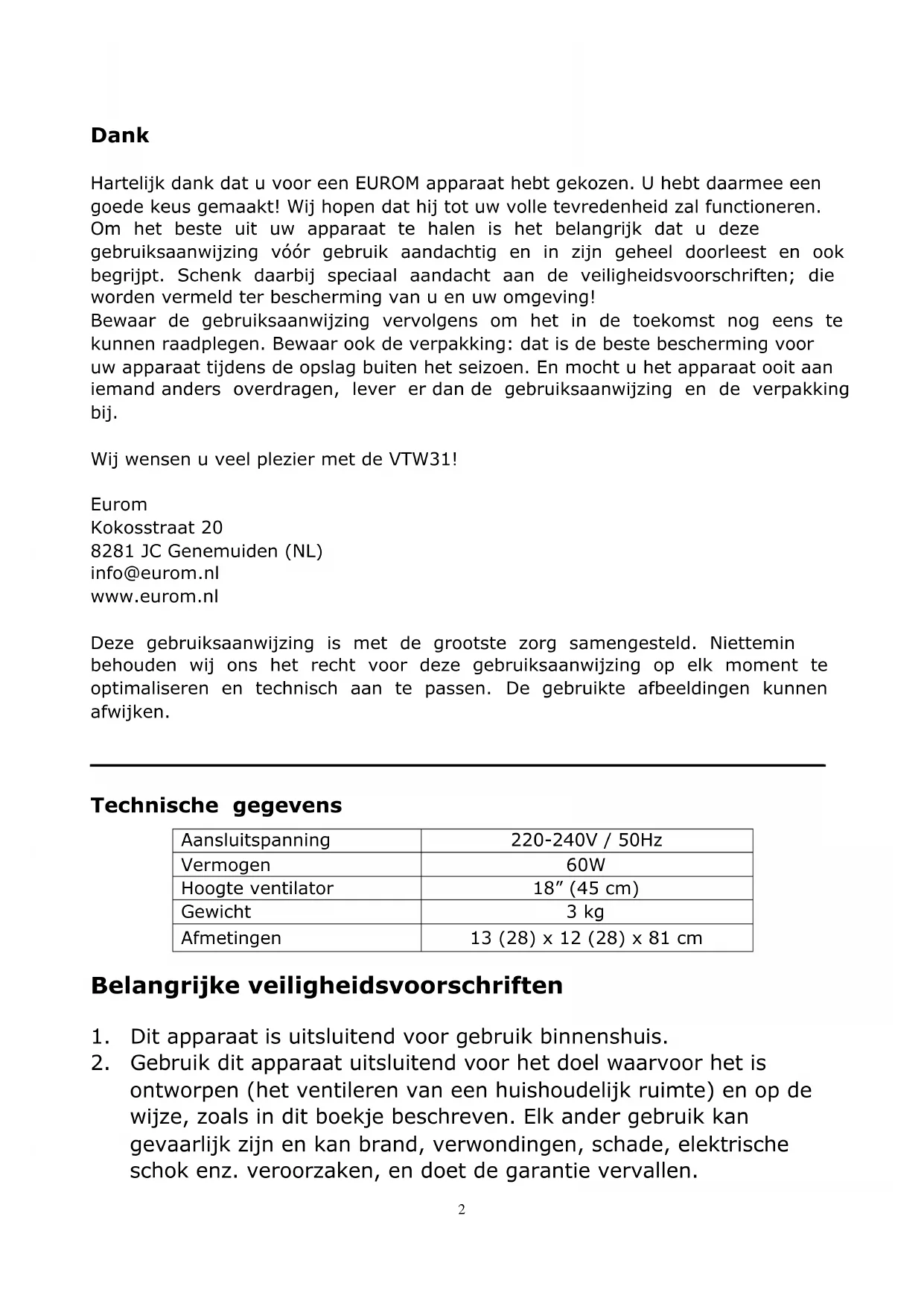 Dank Hartelijk dank dat u voor een EUROM apparaat hebt gekozen. U hebt daarmee een goede keus gemaakt! Wij hopen dat hij tot uw volle tevredenheid zal functioneren. Om het beste uit uw apparaat te halen is het belangrijk dat u deze gebruiksaanwijzing vóór gebruik aandachtig en in zijn geheel doorleest en ook begrijpt. Schenk daarbij speciaal aandacht aan de veiligheidsvoorschriften; die worden vermeld ter bescherming van u en uw omgeving! Bewaar de gebruiksaanwijzing vervolgens om het in de toekomst nog eens te kunnen raadplegen. Bewaar ook de verpakking: dat is de beste bescherming voor uw apparaat tijdens de opslag buiten het seizoen. En mocht u het apparaat ooit aan iemand anders overdragen, lever er dan de gebruiksaanwijzing en de verpakking bij. Wij wensen u veel plezier met de VTW31! Eurom Kokosstraat 20 8281 JC Genemuiden (NL) info@eurom.nl www.eurom.nl Deze gebruiksaanwijzing is met de grootste zorg samengesteld. Niettemin behouden wij ons het recht voor deze gebruiksaanwijzing op elk moment te optimaliseren en technisch aan te passen. De gebruikte afbeeldingen kunnen afwijken.
