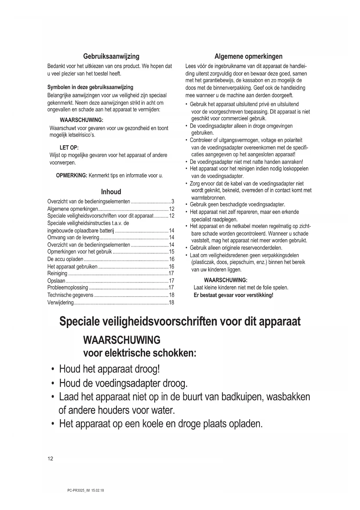 - Het apparaat op een koele en droge plaats opladen.PC-PR3025_IM 15.02.18