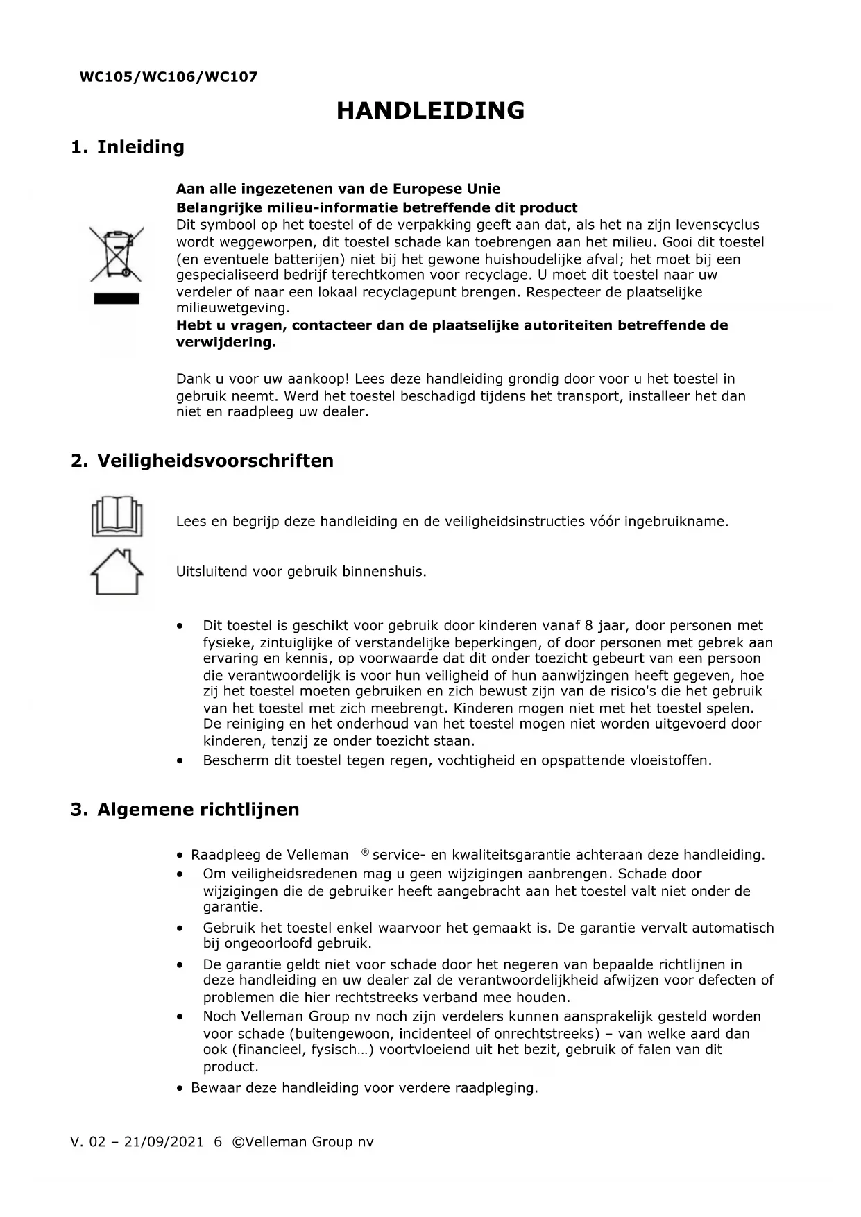 Velleman Group nv heeft het auteursrecht voor deze handleiding. Alle wereldwijde rechten voorbehouden. Het is niet toegestaan om deze handleiding of gedeelten ervan over te nemen, te kopiëren, te vertalen, te bewerken en op te slaan op een elektronisch medium zonder voorafgaande schriftelijke toestemming van de rechthebbende.WC105/WC106/WC107
