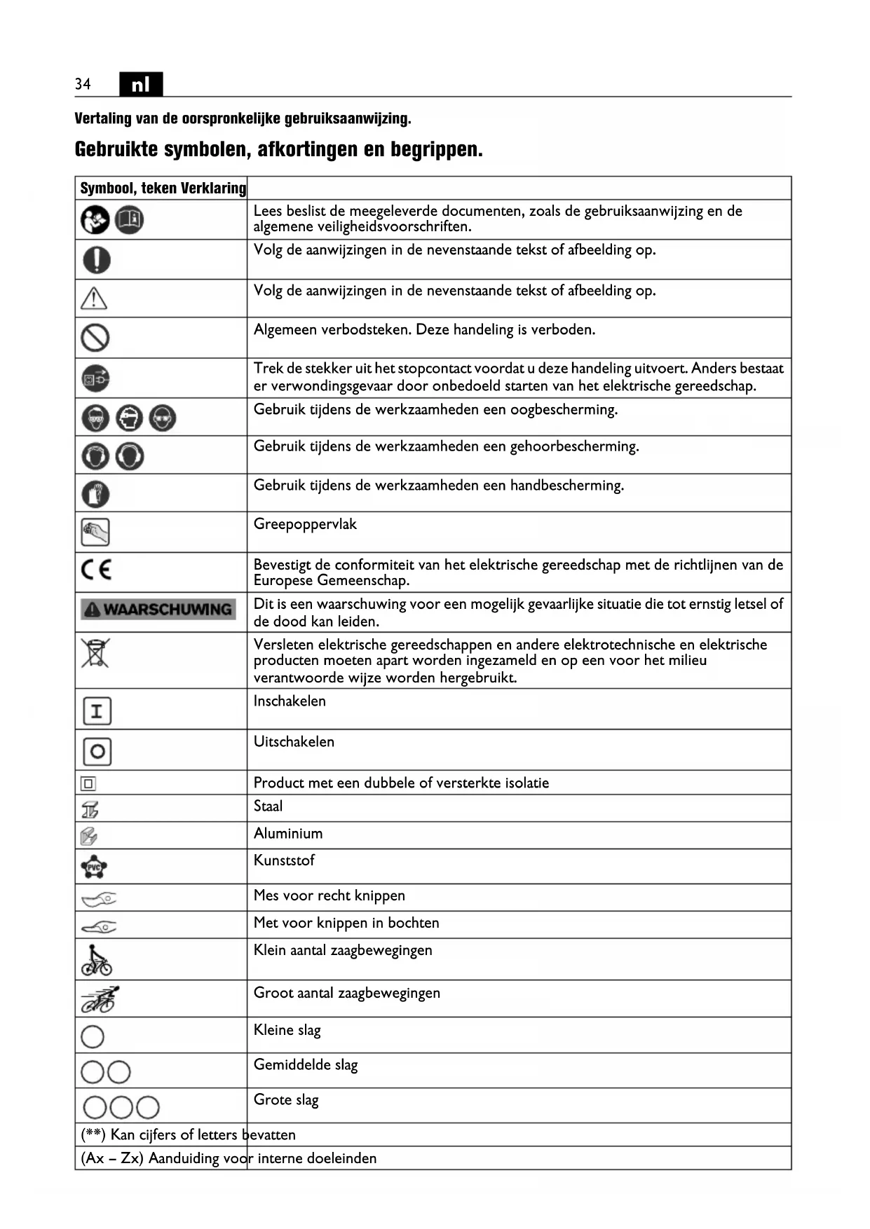 Vertaling van de oorspronkelijke gebruiksaanwijzing. Gebruikte symbolen, afkortingen en begrippen. Symbool, teken Verklaring Lees beslist de meegeleverde documenten, zoals de gebruiksaanwijzing en de algemene veiligheidsvoorschriften. Volg de aanwijzingen in de nevenstaande tekst of afbeelding op. Volg de aanwijzingen in de nevenstaande tekst of afbeelding op. Algemeen verbodsteken. Deze handeling is verboden. Trek de stekker uit het stopcontact voordat u deze handeling uitvoert. Anders bestaat er verwondingsgevaar door onbedoeld starten van het elektrische gereedschap. Gebruik tijdens de werkzaamheden een oogbescherming. Gebruik tijdens de werkzaamheden een gehoorbescherming. Gebruik tijdens de werkzaamheden een handbescherming. Greepoppervlak Bevestigt de conformiteit van het elektrische gereedschap met de richtlijnen van de Europese Gemeenschap. Dit is een waarschuwing voor een mogelijk gevaarlijke situatie die tot ernstig letsel of de dood kan leiden. Versleten elektrische gereedschappen en andere elektrotechnische en elektrische producten moeten apart worden ingezameld en op een voor het milieu verantwoorde wijze worden hergebruikt. Inschakelen Uitschakelen Product met een dubbele of versterkte isolatie Staal Aluminium Kunststof Mes voor recht knippen Met voor knippen in bochten Klein aantal zaagbewegingen Groot aantal zaagbewegingen Kleine slag Gemiddelde slag Grote slag (**) Kan cijfers of letters bevatten (Ax – Zx) Aanduiding voor interne doeleinden35