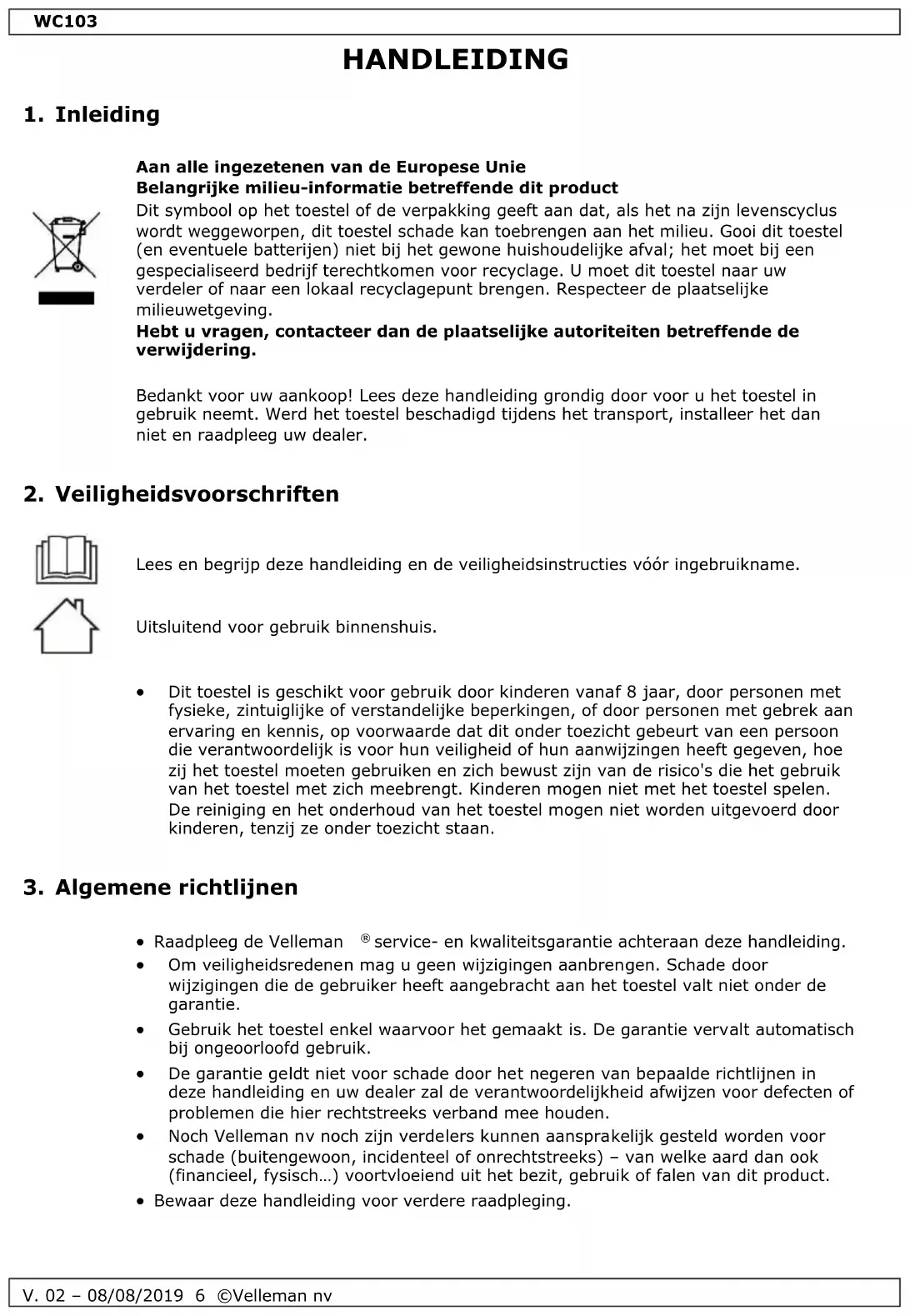 Velleman® service- en kwaliteitsgarantie Velleman® heeft sinds zijn oprichting in 1972 een ruime ervaring opgebouwd in de elektronicawereld en verdeelt op dit moment producten in meer dan 85 landen. Al onze producten beantwoorden aan strikte kwaliteitseisen en aan de wettelijke bepalingen geldig in de EU. Om de kwaliteit te waarborgen, ondergaan onze producten op regelmatige tijdstippen een extra kwaliteitscontrole, zowel door onze eigen kwaliteitsafdeling als door externe gespecialiseerde organisaties. Mocht er ondanks deze voorzorgen toch een probleem optreden, dan kunt u steeds een beroep doen op onze waarborg (zie waarborgvoorwaarden). Algemene waarborgvoorwaarden consumentengoederen (voor Europese Unie):