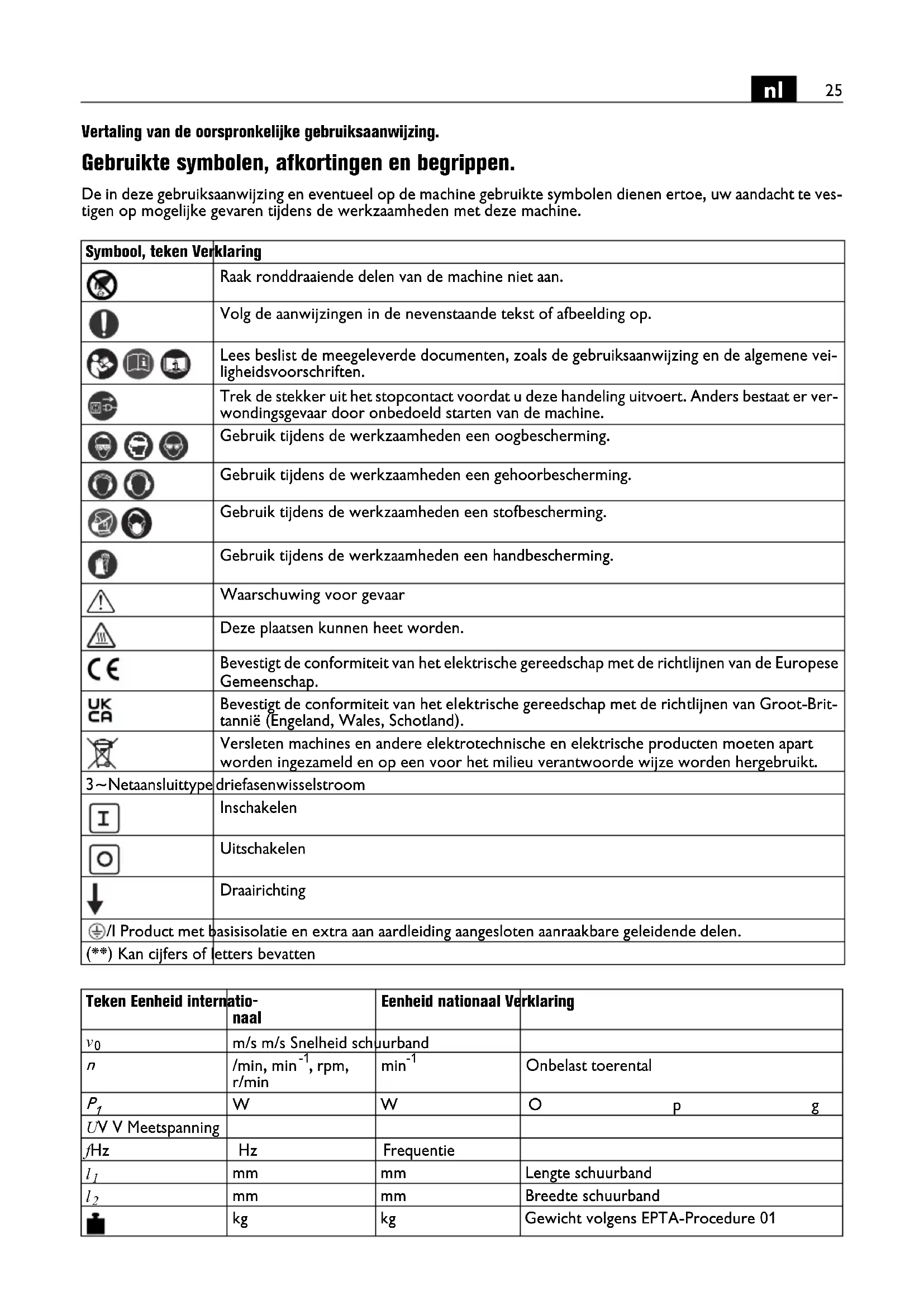 Vertaling van de oorspronkelijke gebruiksaanwijzing. Gebruikte symbolen, afkortingen en begrippen. De in deze gebruiksaanwijzing en eventueel op de machine gebruikte symbolen dienen ertoe, uw aandacht te ves- tigen op mogelijke gevaren tijdens de werkzaamheden met deze machine. Symbool, teken Verklaring Raak ronddraaiende delen van de machine niet aan. Volg de aanwijzingen in de nevenstaande tekst of afbeelding op. Lees beslist de meegeleverde documenten, zoals de gebruiksaanwijzing en de algemene vei- ligheidsvoorschriften. Trek de stekker uit het stopcontact voordat u deze handeling uitvoert. Anders bestaat er ver- wondingsgevaar door onbedoeld starten van de machine. Gebruik tijdens de werkzaamheden een oogbescherming. Gebruik tijdens de werkzaamheden een gehoorbescherming. Gebruik tijdens de werkzaamheden een stofbescherming. Gebruik tijdens de werkzaamheden een handbescherming. Waarschuwing voor gevaar Deze plaatsen kunnen heet worden. Bevestigt de conformiteit van het elektrische gereedschap met de richtlijnen van de Europese Gemeenschap. Bevestigt de conformiteit van het elektrische gereedschap met de richtlijnen van Groot-Brit- tannië (Engeland, Wales, Schotland). Versleten machines en andere elektrotechnische en elektrische producten moeten apart worden ingezameld en op een voor het milieu verantwoorde wijze worden hergebruikt. 3 ~ Netaansluittype driefasenwisselstroom Inschakelen Uitschakelen Draairichting /I Product met basisisolatie en extra aan aardleiding aangesloten aanraakbare geleidende delen. (**) Kan cijfers of letters bevatten Teken Eenheid internatio- naal Eenheid nationaal Verklaring