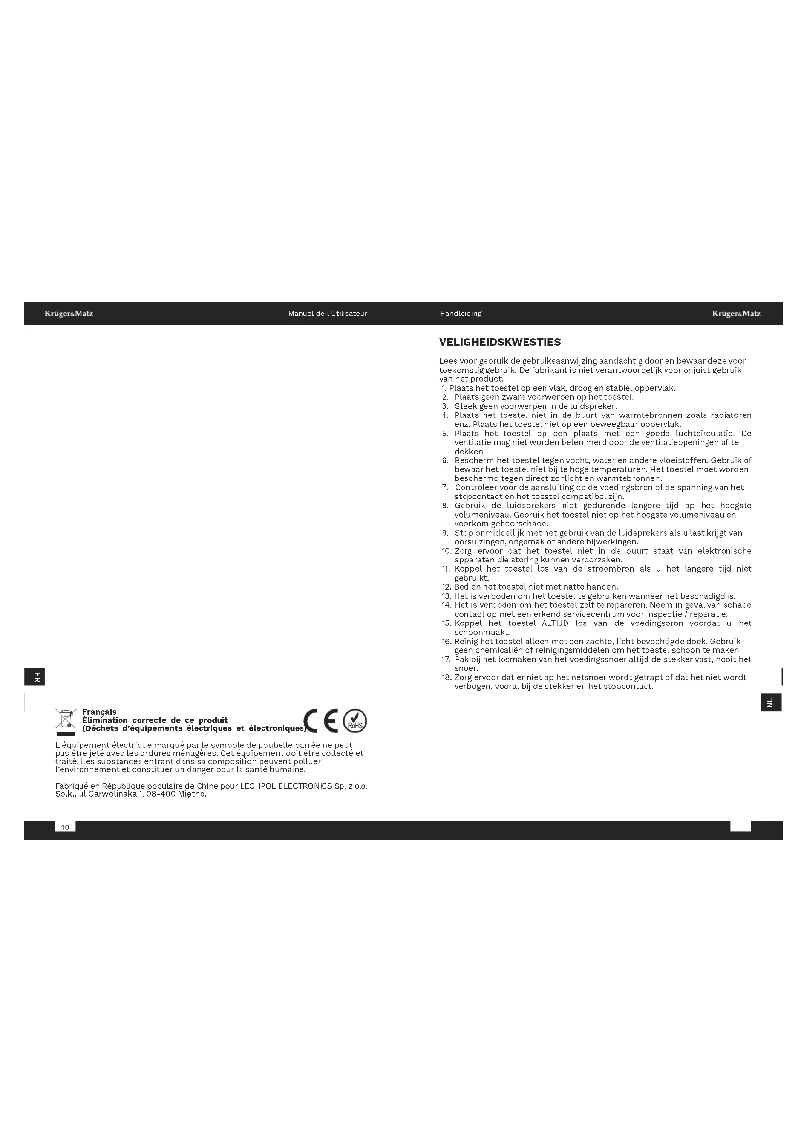 VELIGHEIDSKWESTIES Lees voor gebruik de gebruiksaanwijzing aandachtig door en bewaar deze voor toekomstig gebruik. De fabrikant is niet verantwoordelijk voor onjuist gebruik van het product.