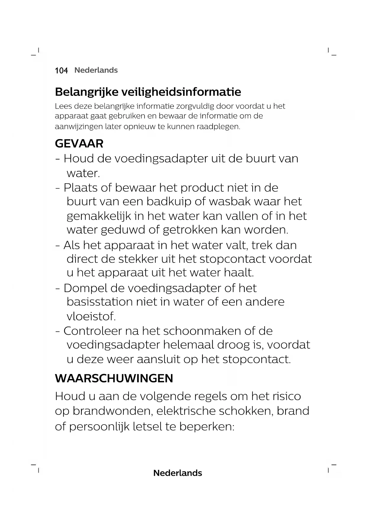 ItalianoNederlands Belangrijke veiligheidsinformatie Lees deze belangrijke informatie zorgvuldig door voordat u het apparaat gaat gebruiken en bewaar de informatie om de aanwijzingen later opnieuw te kunnen raadplegen. GEVAAR - Houd de voedingsadapter uit de buurt van water. - Plaats of bewaar het product niet in de buurt van een badkuip of wasbak waar het gemakkelijk in het water kan vallen of in het water geduwd of getrokken kan worden. - Als het apparaat in het water valt, trek dan direct de stekker uit het stopcontact voordat u het apparaat uit het water haalt. - Dompel de voedingsadapter of het basisstation niet in water of een andere vloeistof. - Controleer na het schoonmaken of de voedingsadapter helemaal droog is, voordat u deze weer aansluit op het stopcontact. WAARSCHUWINGEN Houd u aan de volgende regels om het risico op brandwonden, elektrische schokken, brand of persoonlijk letsel te beperken:
