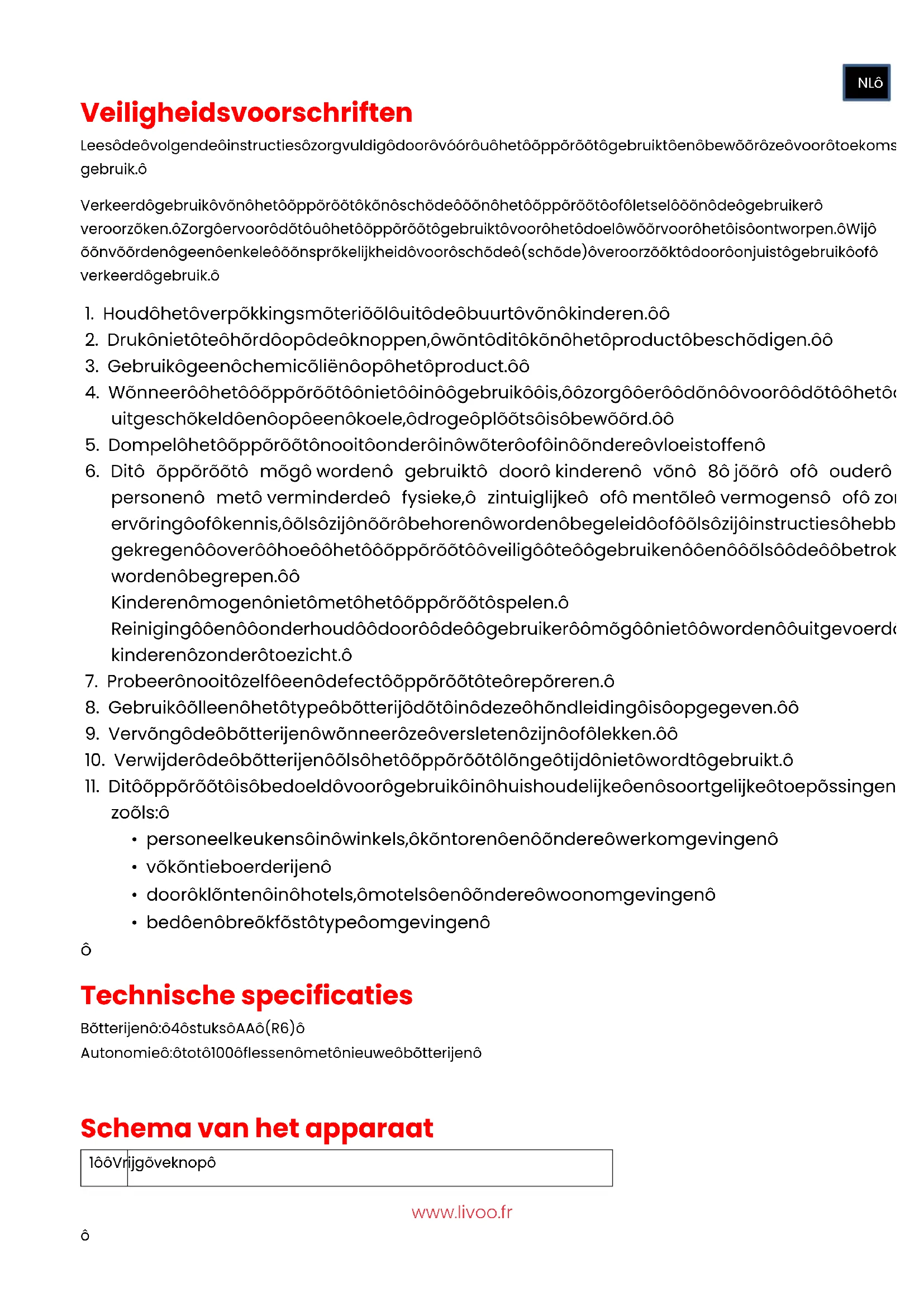 @Livoo PTwww.livoo.fr Veiligheidsvoorschriften Lees de volgende instructies zorgvuldig door vóór u het apparaat gebruikt en bewaar ze voor toekomstig gebruik. Verkeerd gebruik van het apparaat kan schade aan het apparaat of letsel aan de gebruiker veroorzaken. Zorg ervoor dat u het apparaat gebruikt voor het doel waarvoor het is ontworpen. Wij aanvaarden geen enkele aansprakelijkheid voor schade (schade) veroorzaakt door onjuist gebruik of verkeerd gebruik.