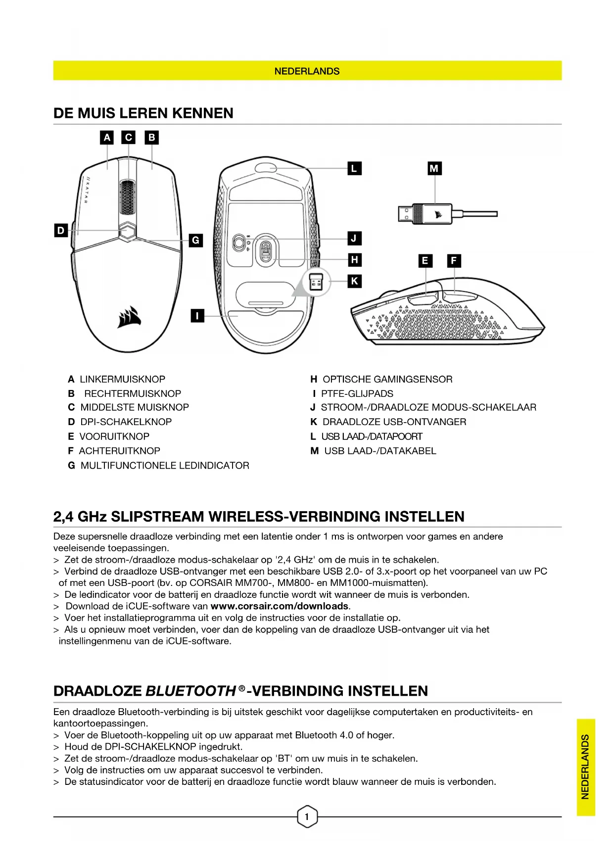 2,4 GHz SLIPSTREAM WIRELESS-VERBINDING INSTELLEN Deze supersnelle draadloze verbinding met een latentie onder 1 ms is ontworpen voor games en andere veeleisende toepassingen. > Zet de stroom-/draadloze modus-schakelaar op '2,4 GHz' om de muis in te schakelen. > Verbind de draadloze USB-ontvanger met een beschikbare USB 2.0- of 3.x-poort op het voorpaneel van uw PC of met een USB-poort (bv. op CORSAIR MM700-, MM800- en MM1000-muismatten). > De ledindicator voor de batterij en draadloze functie wordt wit wanneer de muis is verbonden. > Download de iCUE-software van www.corsair.com/downloads. > Voer het installatieprogramma uit en volg de instructies voor de installatie op. > Als u opnieuw moet verbinden, voer dan de koppeling van de draadloze USB-ontvanger uit via het instellingenmenu van de iCUE-software. DRAADLOZE BLUETOOTH