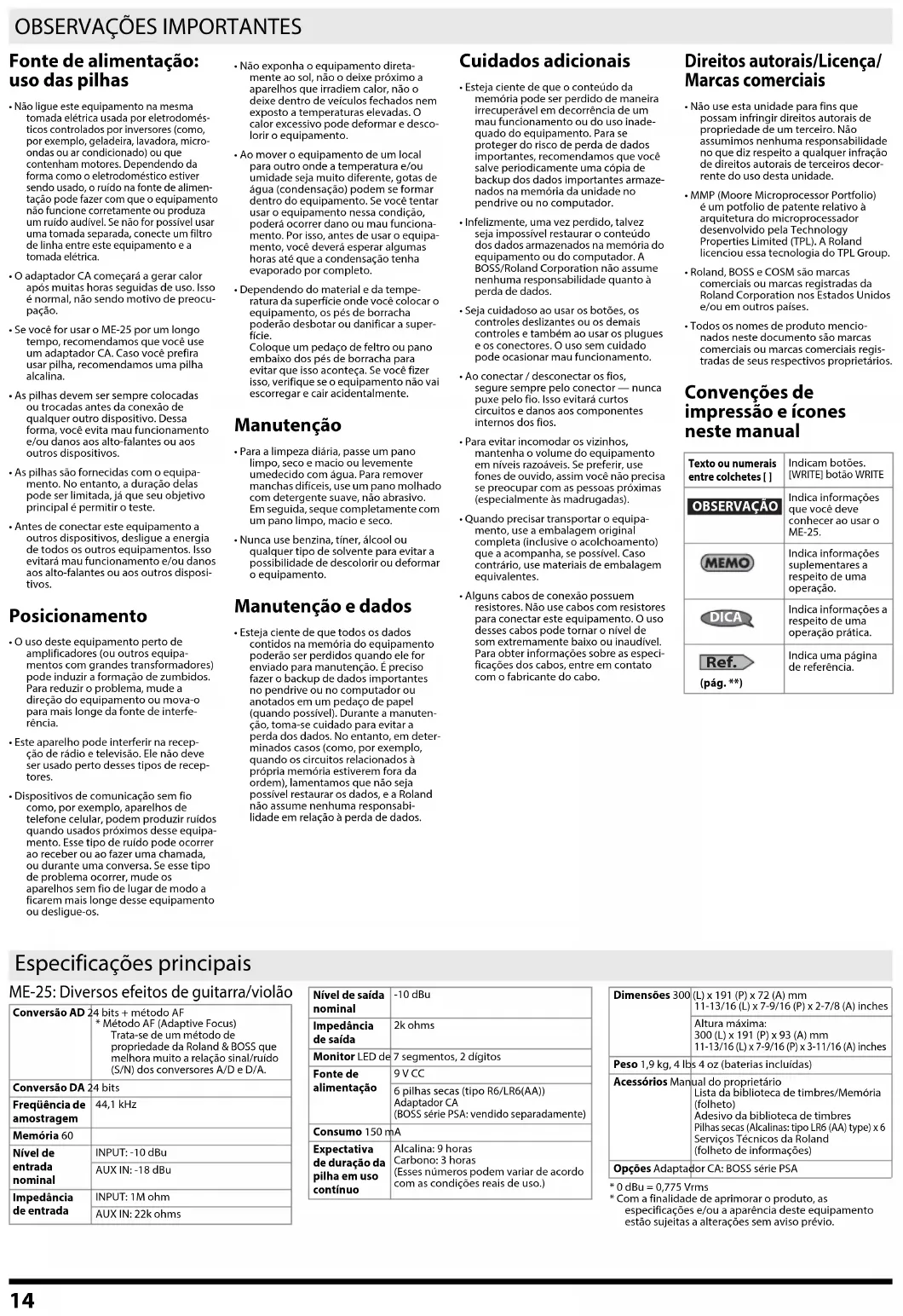 - Gebruik dit apparaat niet voor doeleinden die de auteursrechten van een derde kunnen schenden. Wij zijn niet verantwoordelijk voor schendingen van auteursrechten van derden door uw gebruik van dit apparaat.• MMP (Moore Microprocessor Portfolio) verwijst naar een patentportfolio betreffende microprocessorarchi-tectuur, ontworpen door Technology Properties Limited (TPL). Roland heeft van de TPL Group de licentie verkregen tot gebruik van deze technologie.• Roland, BOSS en COSM zijn gedepo-neerde handelsmerken of handels-merken van Roland Corporation in de Verenigde Staten en/of andere landen.• Alle productnamen die in dit document worden vermeld, zijn handelsmerken of gedeponeerde handelsmerken van de respectieve eigenaars. Drukovereenkomsten en pictogrammen in deze handleiding BELANGRIJKE OPMERKINGEN Tekst of cijfers in vierkante haken [ ] duiden knoppen aan. [WRITE] WRITE- knop Duidt informatie aan waaraan u moet denken als u de ME-25 gebruikt. Duidt extra informatie aan over een functie. Duidt informatie aan over een handige functie. (p. **) Duidt een referentiepagina aan. OPMERKING ME-25: multi-effecten voor gitaar