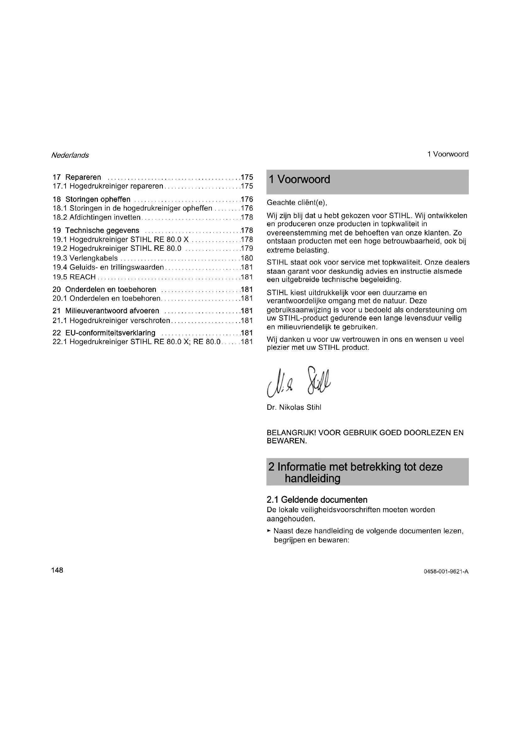 ANDREAS STIHL AG & Co. KG Badstraße 115 D-71336 Waiblingen Duitsland verklaart op eigen verantwoordelijkheid dat – Constructie: Hogedrukreiniger – merk: STIHL – Type: RE 80.0 X; 80.0 – Serie-identificatie: RE02 voldoet aan de betreffende bepalingen van de richtlijnen 2011/65/EU, 2006/42/EG, 2014/30/EU, 2009/125/EC en in overeenstemming met de ten tijde van de productiedatum geldende versies van de volgende normen is ontwikkeld en geproduceerd: EN 55014-1, EN 55014-2, EN 60335-1, EN 60335-2-79, EN 61000-3-2, EN 61000-3-11. Het gemeten en het gegarandeerde geluidsvermogenniveau is bepaald in overeenstemming met richtlijn 2000/14/EG, bijlage V, onder toepassing van de norm ISO 3744. 20 Onderdelen en toebehoren Deze symbolen kenmerken de originele STIHL onderdelen en het originele STIHL toebehoren. 21 Milieuverantwoord afvoeren 22 EU-conformiteitsverklaring0458-001-9621-A