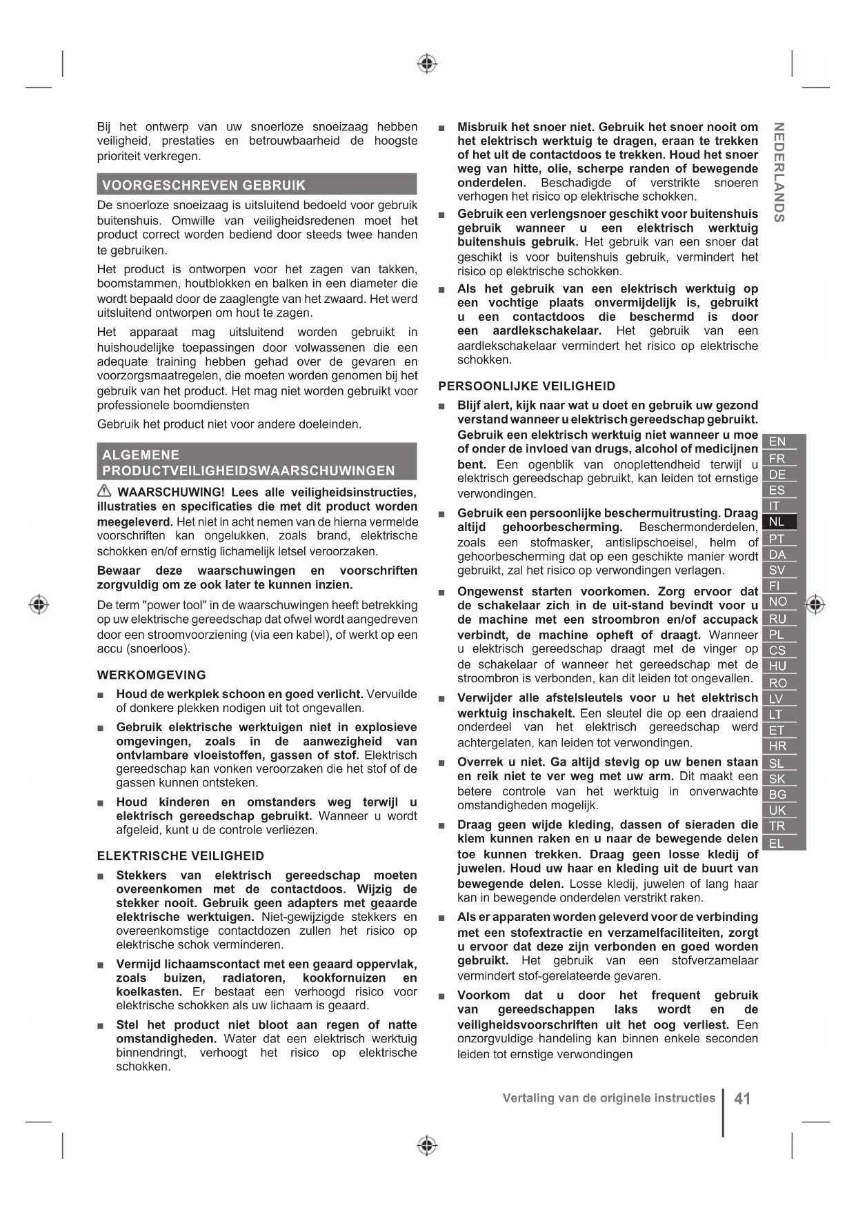 Bij het ontwerp van uw snoerloze snoeizaag hebben veiligheid, prestaties en betrouwbaarheid de hoogste prioriteit verkregen. VOORGESCHREVEN GEBRUIK De snoerloze snoeizaag is uitsluitend bedoeld voor gebruik buitenshuis. Omwille van veiligheidsredenen moet het product correct worden bediend door steeds twee handen te gebruiken. Het product is ontworpen voor het zagen van takken, boomstammen, houtblokken en balken in een diameter die wordt bepaald door de zaaglengte van het zwaard. Het werd uitsluitend ontworpen om hout te zagen. Het apparaat mag uitsluitend worden gebruikt in huishoudelijke toepassingen door volwassenen die een adequate training hebben gehad over de gevaren en voorzorgsmaatregelen, die moeten worden genomen bij het gebruik van het product. Het mag niet worden gebruikt voor professionele boomdiensten Gebruik het product niet voor andere doeleinden. ALGEMENE PRODUCTVEILIGHEIDSWAARSCHUWINGEN WAARSCHUWING! Lees alle veiligheidsinstructies, illustraties en specificaties die met dit product worden meegeleverd. Het niet in acht nemen van de hierna vermelde voorschriften kan ongelukken, zoals brand, elektrische schokken en/of ernstig lichamelijk letsel veroorzaken. Bewaar deze waarschuwingen en voorschriften zorgvuldig om ze ook later te kunnen inzien. De term "power tool" in de waarschuwingen heeft betrekking op uw elektrische gereedschap dat ofwel wordt aangedreven door een stroomvoorziening (via een kabel), of werkt op een accu (snoerloos). WERKOMGEVING ■ Houd de werkplek schoon en goed verlicht. Vervuilde of donkere plekken nodigen uit tot ongevallen. ■ Gebruik elektrische werktuigen niet in explosieve omgevingen, zoals in de aanwezigheid van ontvlambare vloeistoffen, gassen of stof. Elektrisch gereedschap kan vonken veroorzaken die het stof of de gassen kunnen ontsteken. ■ Houd kinderen en omstanders weg terwijl u elektrisch gereedschap gebruikt. Wanneer u wordt afgeleid, kunt u de controle verliezen. ELEKTRISCHE VEILIGHEID ■ Stekkers van elektrisch gereedschap moeten overeenkomen met de contactdoos. Wijzig de stekker nooit. Gebruik geen adapters met geaarde elektrische werktuigen. Niet-gewijzigde stekkers en overeenkomstige contactdozen zullen het risico op elektrische schok verminderen. ■ Vermijd lichaamscontact met een geaard oppervlak, zoals buizen, radiatoren, kookfornuizen en koelkasten. Er bestaat een verhoogd risico voor elektrische schokken als uw lichaam is geaard. ■ Stel het product niet bloot aan regen of natte omstandigheden. Water dat een elektrisch werktuig binnendringt, verhoogt het risico op elektrische schokken. ■ Misbruik het snoer niet. Gebruik het snoer nooit om het elektrisch werktuig te dragen, eraan te trekken of het uit de contactdoos te trekken. Houd het snoer weg van hitte, olie, scherpe randen of bewegende onderdelen. Beschadigde of verstrikte snoeren verhogen het risico op elektrische schokken. ■ Gebruik een verlengsnoer geschikt voor buitenshuis gebruik wanneer u een elektrisch werktuig buitenshuis gebruik. Het gebruik van een snoer dat geschikt is voor buitenshuis gebruik, vermindert het risico op elektrische schokken. ■ Als het gebruik van een elektrisch werktuig op een vochtige plaats onvermijdelijk is, gebruikt u een contactdoos die beschermd is door een aardlekschakelaar. Het gebruik van een aardlekschakelaar vermindert het risico op elektrische schokken. PERSOONLIJKE VEILIGHEID ■ Blijf alert, kijk naar wat u doet en gebruik uw gezond verstand wanneer u elektrisch gereedschap gebruikt. Gebruik een elektrisch werktuig niet wanneer u moe of onder de invloed van drugs, alcohol of medicijnen bent. Een ogenblik van onoplettendheid terwijl u elektrisch gereedschap gebruikt, kan leiden tot ernstige verwondingen. ■ Gebruik een persoonlijke beschermuitrusting. Draag altijd gehoorbescherming. Beschermonderdelen, zoals een stofmasker, antislipschoeisel, helm of gehoorbescherming dat op een geschikte manier wordt gebruikt, zal het risico op verwondingen verlagen. ■ Ongewenst starten voorkomen. Zorg ervoor dat de schakelaar zich in de uit-stand bevindt voor u de machine met een stroombron en/of accupack verbindt, de machine opheft of draagt. Wanneer u elektrisch gereedschap draagt met de vinger op de schakelaar of wanneer het gereedschap met de stroombron is verbonden, kan dit leiden tot ongevallen. ■ Verwijder alle afstelsleutels voor u het elektrisch werktuig inschakelt. Een sleutel die op een draaiend onderdeel van het elektrisch gereedschap werd achtergelaten, kan leiden tot verwondingen. ■ Overrek u niet. Ga altijd stevig op uw benen staan en reik niet te ver weg met uw arm. Dit maakt een betere controle van het werktuig in onverwachte omstandigheden mogelijk. ■ Draag geen wijde kleding, dassen of sieraden die klem kunnen raken en u naar de bewegende delen toe kunnen trekken. Draag geen losse kledij of juwelen. Houd uw haar en kleding uit de buurt van bewegende delen. Losse kledij, juwelen of lang haar kan in bewegende onderdelen verstrikt raken. ■ Als er apparaten worden geleverd voor de verbinding met een stofextractie en verzamelfaciliteiten, zorgt u ervoor dat deze zijn verbonden en goed worden gebruikt. Het gebruik van een stofverzamelaar vermindert stof-gerelateerde gevaren. ■ Voorkom dat u door het frequent gebruik van gereedschappen laks wordt en de veiligheidsvoorschriften uit het oog verliest. Een onzorgvuldige handeling kan binnen enkele seconden leiden tot ernstige verwondingen42 Vertaling van de originele instructies GEBRUIK VAN EN ZORG VOOR UW ELEKTRISCH GEREEDSCHAP ■ Forceer het product niet. Gebruik het correcte werktuig voor uw toepassing. Het juiste werktuig zal de taak beter en veiliger uitvoeren aan het tempo waarvoor het werd ontworpen. ■ Gebruik het elektrisch werktuig niet als de schakelaar het niet kan in- of uitschakelen. Een elektrisch werktuig dat niet met behulp van de schakelaar kan worden bediend, is gevaarlijk en moet worden gerepareerd. ■ Trek de stekker uit de contactdoos en/o