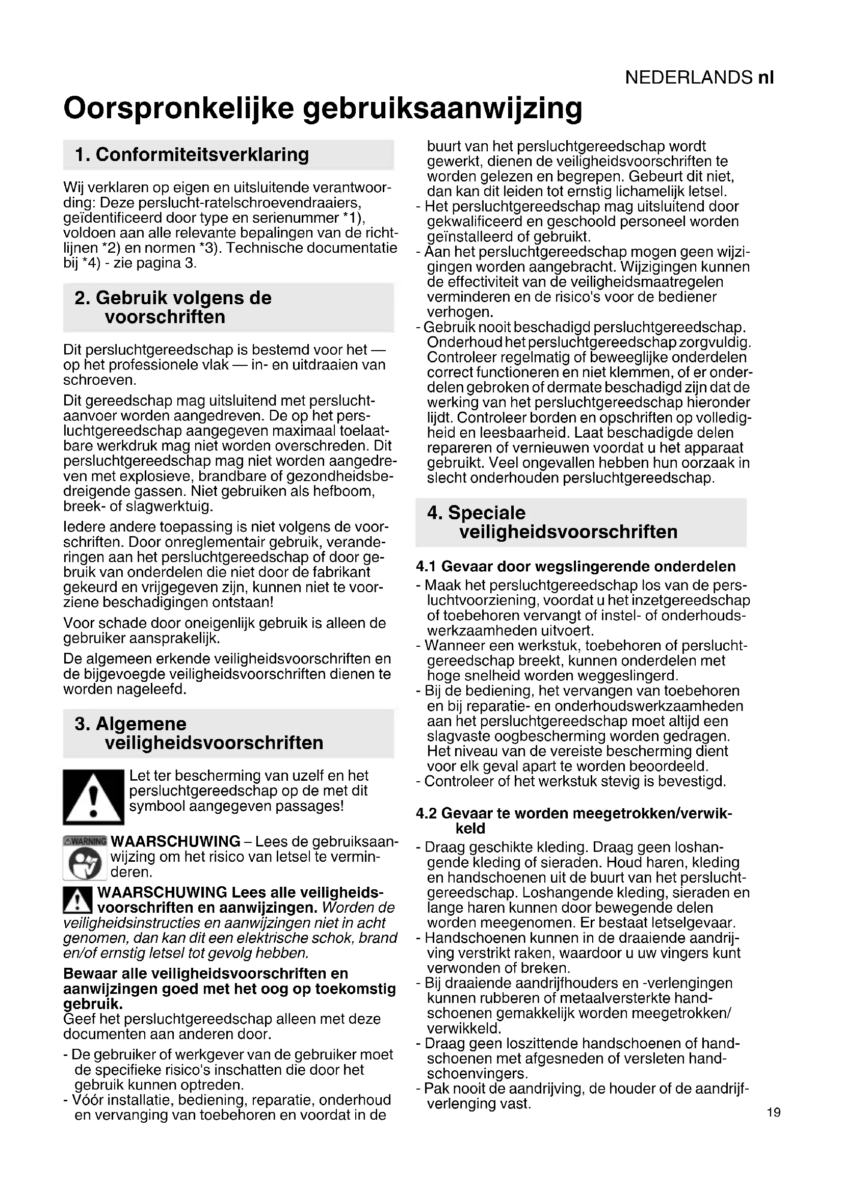 Oorspronkelijke gebruiksaanwijzing Wij verklaren op eigen en uitsluitende verantwoor- ding: Deze perslucht-ratelschroevendraaiers, geïdentificeerd door type en serienummer *1), voldoen aan alle relevante bepalingen van de richt- lijnen *2) en normen *3). Technische documentatie bij *4) - zie pagina 3. Dit persluchtgereedschap is bestemd voor het — op het professionele vlak — in- en uitdraaien van schroeven. Dit gereedschap mag uitsluitend met perslucht- aanvoer worden aangedreven. De op het pers- luchtgereedschap aangegeven maximaal toelaat- bare werkdruk mag niet worden overschreden. Dit persluchtgereedschap mag niet worden aangedre- ven met explosieve, brandbare of gezondheidsbe- dreigende gassen. Niet gebruiken als hefboom, breek- of slagwerktuig. Iedere andere toepassing is niet volgens de voor- schriften. Door onreglementair gebruik, verande- ringen aan het persluchtgereedschap of door ge- bruik van onderdelen die niet door de fabrikant gekeurd en vrijgegeven zijn, kunnen niet te voor- ziene beschadigingen ontstaan! Voor schade door oneigenlijk gebruik is alleen de gebruiker aansprakelijk. De algemeen erkende veiligheidsvoorschriften en de bijgevoegde veiligheidsvoorschriften dienen te worden nageleefd. Let ter bescherming van uzelf en het persluchtgereedschap op de met dit symbool aangegeven passages! WAARSCHUWING – Lees de gebruiksaan- wijzing om het risico van letsel te vermin- deren. WAARSCHUWING Lees alle veiligheids- voorschriften en aanwijzingen. Worden de veiligheidsinstructies en aanwijzingen niet in acht genomen, dan kan dit een elektrische schok, brand en/of ernstig letsel tot gevolg hebben. Bewaar alle veiligheidsvoorschriften en aanwijzingen goed met het oog op toekomstig gebruik. Geef het persluchtgereedschap alleen met deze documenten aan anderen door. - De gebruiker of werkgever van de gebruiker moet de specifieke risico's inschatten die door het gebruik kunnen optreden. - Vóór installatie, bediening, reparatie, onderhoud en vervanging van toebehoren en voordat in de buurt van het persluchtgereedschap wordt gewerkt, dienen de veiligheidsvoorschriften te worden gelezen en begrepen. Gebeurt dit niet, dan kan dit leiden tot ernstig lichamelijk letsel. - Het persluchtgereedschap mag uitsluitend door gekwalificeerd en geschoold personeel worden geïnstalleerd of gebruikt. - Aan het persluchtgereedschap mogen geen wijzi- gingen worden aangebracht. Wijzigingen kunnen de effectiviteit van de veiligheidsmaatregelen verminderen en de risico's voor de bediener verhogen. - Gebruik nooit beschadigd persluchtgereedschap. Onderhoud het persluchtgereedschap zorgvuldig. Controleer regelmatig of beweeglijke onderdelen correct functioneren en niet klemmen, of er onder- delen gebroken of dermate beschadigd zijn dat de werking van het persluchtgereedschap hieronder lijdt. Controleer borden en opschriften op volledig- heid en leesbaarheid. Laat beschadigde delen repareren of vernieuwen voordat u het apparaat gebruikt. Veel ongevallen hebben hun oorzaak in slecht onderhouden persluchtgereedschap.