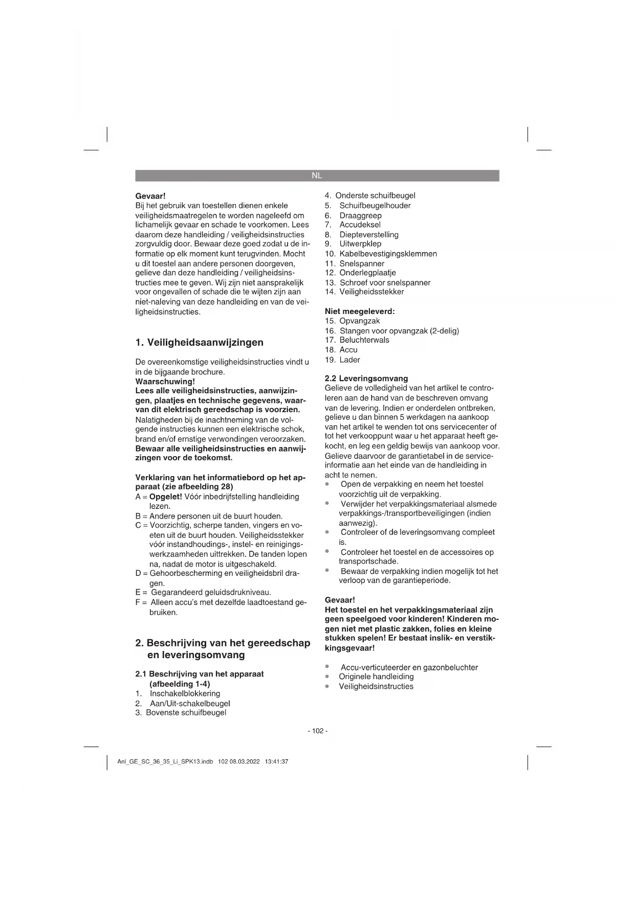 en de accupack naar onze klantenservice. Voor een deskundige verzending verzoeken wij u contact op te nemen met onze klan- tendienst of het verkooppunt waar u het ap- paraat heeft aangekocht. Zorg er bij de verzending of verwerking van accu’s resp. het accu apparaat voor dat deze afzonderlijk worden verpakt in plastic zakken, om kortsluitingen en brand te vermijden! In het belang van een lange levensduur van de accupack is het raadzaam om op tijd voor het herladen van de accupack te zorgen. Dit is in elk geval noodzakelijk, wanneer u vaststelt dat het vermogen van het apparaat afneemt. Ontlaad de accupack nooit helemaal. Dat leidt tot een defect van de accupack! Montage van de accu (fi g. 18-19) Montage van de accu (afbeelding 18-19) Open het accudeksel (afbeelding 18, pos. 7). Steek dan de beide accu’s zoals getoond in afbeelding 19 in de adapters, tot deze hoorbaar vastklikken. Aanwijzing! Gebruik alleen accu´s met dezelfde vulstand, combineer nooit volle en halfvolle accu´s met el- Anl_GE_SC_36_35_Li_SPK13.indb 105 08.03.2022 13:41:38NL
