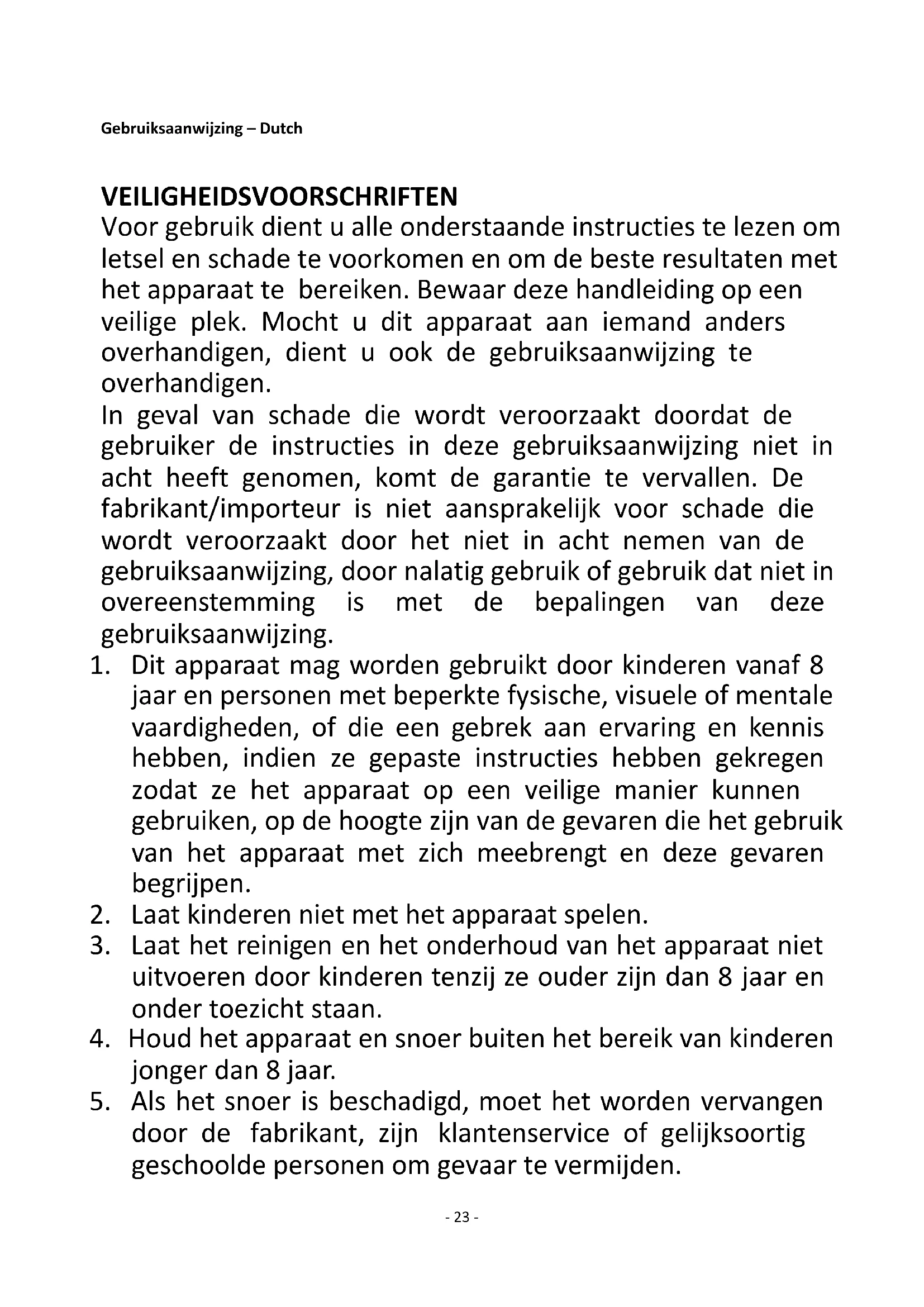 Återvinning - EU-direktiv 2012/19/EU Denna markering indikerar att produkten inte får kastas tillsammans med övrigt hushållsavfall. För att förhindra eventuell miljöförstöring och eventuella hälsorisker på grund av icke kontrollerad avyttring ska den avyttras med ansvar för att materialet ska kunna återanvändas på ett hållbart sätt. Returnera den använda enheten enligt retur- och insamlingssystem eller kontakta återförsäljaren som sålt produkten. Återförsäljaren kan ombesörja att produkten återvinns på ett miljömässigt säkert sätt. Emerio B.V. Customer service: Kundeninformation: Klantenservice: Oudeweg 115 T: +31 (0) 23 3034369 T: +49 (0) 3222 1097 600 T: +31 (0) 23 3034369 2031 CC Haarlem www.emerio.eu/service www.emerio.eu/service www.emerio.eu/service The Netherlands Looking for spare parts? Have a look at www.spareparts.emerio.eu Sie brauchen Ersatzteile? Besuchen Sie www.ersatzteile.emerio.eu Onderdelen nodig? Kijk op www.onderdelen.emerio.eu- 23 - Gebruiksaanwijzing – Dutch VEILIGHEIDSVOORSCHRIFTEN Voor gebruik dient u alle onderstaande instructies te lezen om letsel en schade te voorkomen en om de beste resultaten met het apparaat te bereiken. Bewaar deze handleiding op een veilige plek. Mocht u dit apparaat aan iemand anders overhandigen, dient u ook de gebruiksaanwijzing te overhandigen. In geval van schade die wordt veroorzaakt doordat de gebruiker de instructies in deze gebruiksaanwijzing niet in acht heeft genomen, komt de garantie te vervallen. De fabrikant/importeur is niet aansprakelijk voor schade die wordt veroorzaakt door het niet in acht nemen van de gebruiksaanwijzing, door nalatig gebruik of gebruik dat niet in overeenstemming is met de bepalingen van deze gebruiksaanwijzing.