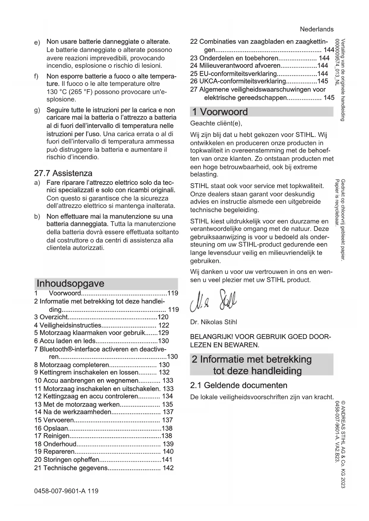 De lokale veiligheidsvoorschriften zijn van kracht. Nederlands 0458-007-9601-A 119 © ANDREAS STIHL AG & Co. KG 2023 0458-007-9601-A. VA2.B23. Gedrukt op chloorvrij gebleekt papier. Papier is recyclebaar. Vertaling van de originele handleiding 0000009574_013_NL► Lees naast deze handleiding de volgende documenten, zorg dat u alles begrijpt en bewaar ze: