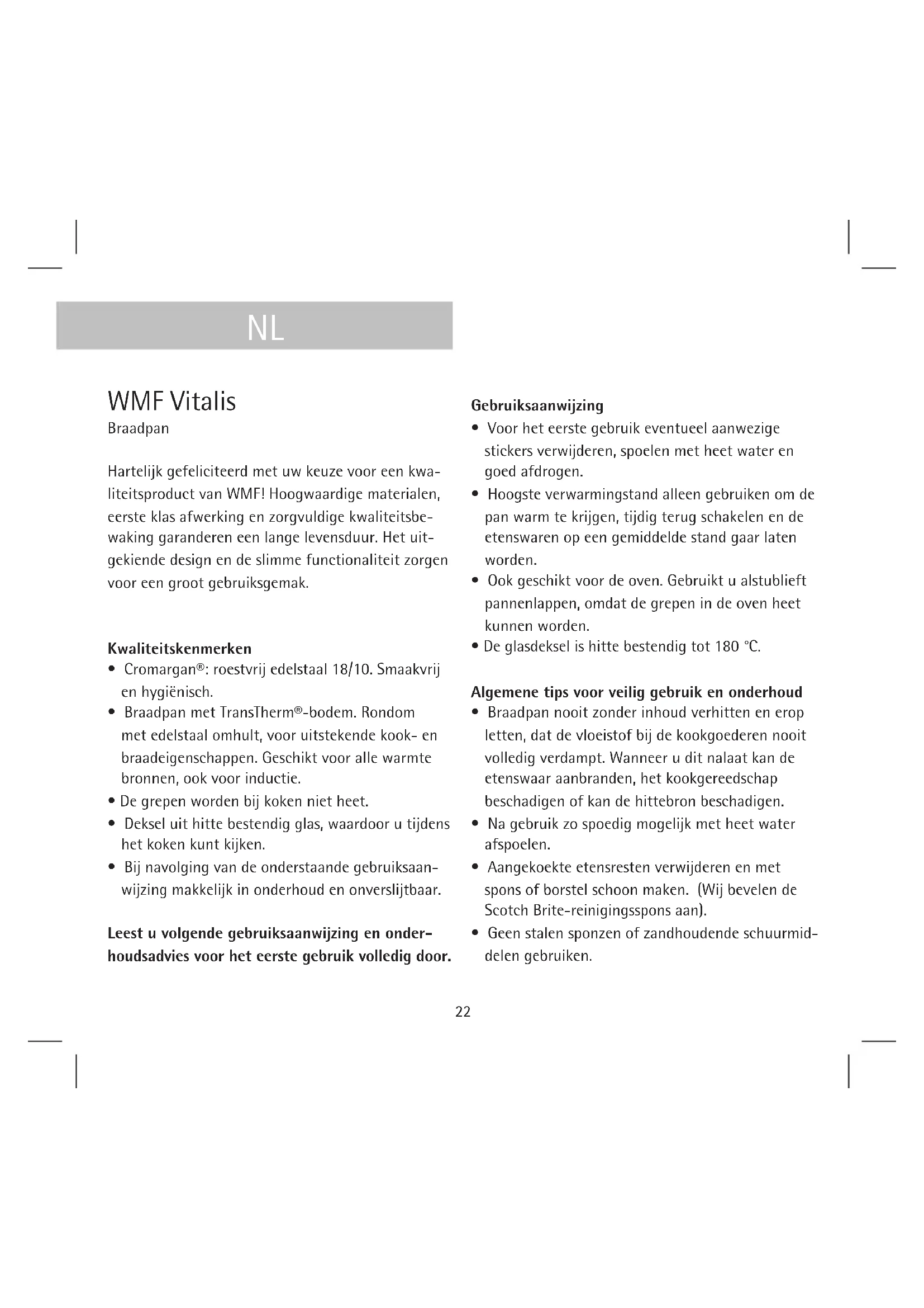 - Geen stalen sponzen of zandhoudende schuurmid- delen gebruiken. WMF Vitalis Braadpan Hartelijk gefeliciteerd met uw keuze voor een kwa- liteitsproduct van WMF! Hoogwaardige materialen, eerste klas afwerking en zorgvuldige kwaliteitsbe- waking garanderen een lange levensduur. Het uit- gekiende design en de slimme functionaliteit zorgen voor een groot gebruiksgemak. Kwaliteitskenmerken