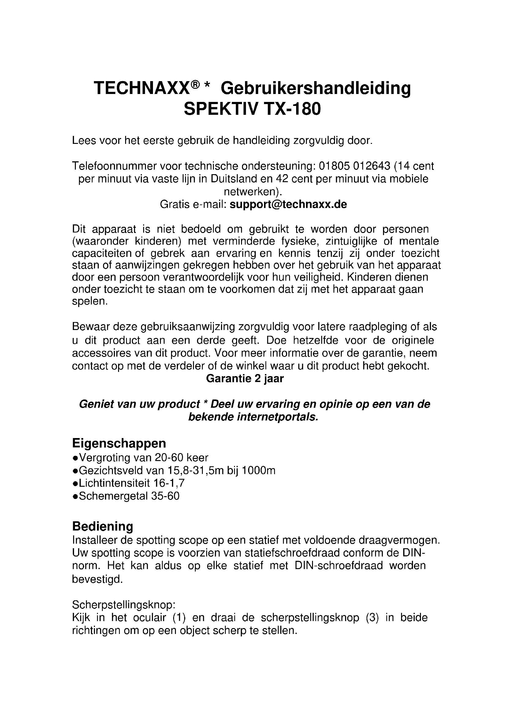 - Gebruikershandleiding SPEKTIV TX-180 Lees voor het eerste gebruik de handleiding zorgvuldig door. Telefoonnummer voor technische ondersteuning: 01805 012643 (14 cent per minuut via vaste lijn in Duitsland en 42 cent per minuut via mobiele netwerken). Gratis e-mail: support@technaxx.de Dit apparaat is niet bedoeld om gebruikt te worden door personen (waaronder kinderen) met verminderde fysieke, zintuiglijke of mentale capaciteiten of gebrek aan ervaring en kennis tenzij zij onder toezicht staan of aanwijzingen gekregen hebben over het gebruik van het apparaat door een persoon verantwoordelijk voor hun veiligheid. Kinderen dienen onder toezicht te staan om te voorkomen dat zij met het apparaat gaan spelen. Bewaar deze gebruiksaanwijzing zorgvuldig voor latere raadpleging of als u dit product aan een derde geeft. Doe hetzelfde voor de originele accessoires van dit product. Voor meer informatie over de garantie, neem contact op met de verdeler of de winkel waar u dit product hebt gekocht. Garantie 2 jaar Geniet van uw product * Deel uw ervaring en opinie op een van de bekende internetportals. Eigenschappen ●Vergroting van 20-60 keer ●Gezichtsveld van 15,8-31,5m bij 1000m ●Lichtintensiteit 16-1,7 ●Schemergetal 35-60 Bediening Installeer de spotting scope op een statief met voldoende draagvermogen. Uw spotting scope is voorzien van statiefschroefdraad conform de DIN- norm. Het kan aldus op elke statief met DIN-schroefdraad worden bevestigd. Scherpstellingsknop: Kijk in het oculair (1) en draai de scherpstellingsknop (3) in beide richtingen om op een object scherp te stellen.Zoom: Draai de zoomregelaar (2) om op een object in of uit te zoomen en gebruik vervolgens de scherpstellingsknop (3) om fijn af te stellen. Zonneklep: Trek de zonneklep (9) uit bij fel zonlicht om een goede zichtbaarheid te hebben. Plaats uw hand rond de diafragmaring van de spotting scope en trek de klep uit. Aardobservatie Tijdens het bekijken van landobjecten zult u observeren doorheen warmtegolven op het aardoppervlak. U zult deze warmtegolven vast wel hebben opgemerkt tijdens het rijden op de autosnelweg tijdens de zomer. Warmtegolven leiden tot een verlies aan beeldkwaliteit. Als de warmtegolven uw kijkervaring verstoren, scherp stel op een lager vermogen voor een vaster beeld van een hogere kwaliteit. observeer vroeg in de ochtend zodat de aarde nog niet te veel interne warmte heeft opgehoopt. Specificaties Vergroting 20-60 x Objectief Ø 60mm Gezichtsveld 15,8-31,5m bij 1000m Gewicht/Afmetingen 840g / 33x15x7 cm