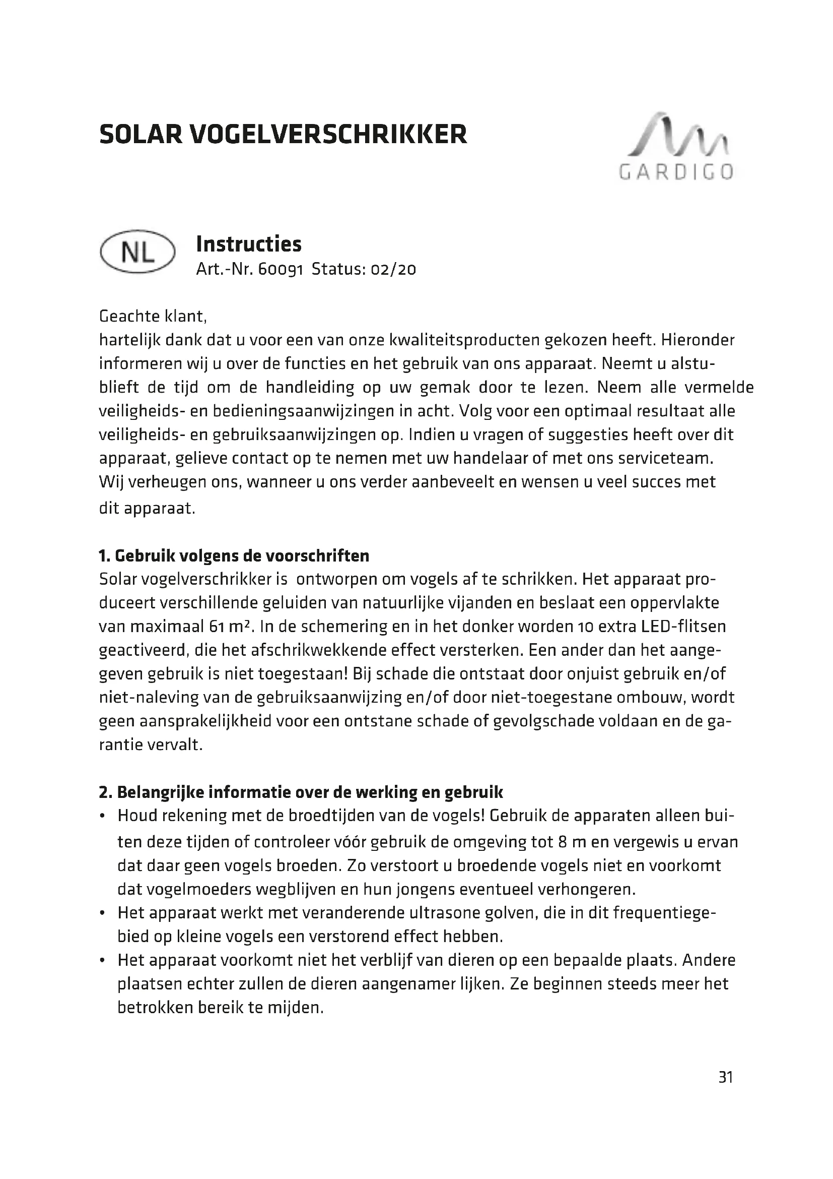GEBRUIKSAANWIJZING 60091 Gardigo