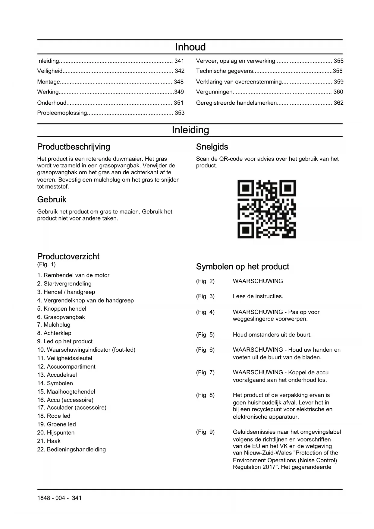 Symbolen op het product (Fig. 2) WAARSCHUWING (Fig. 3) Lees de instructies. (Fig. 4) WAARSCHUWING - Pas op voor weggeslingerde voorwerpen. (Fig. 5) Houd omstanders uit de buurt. (Fig. 6) WAARSCHUWING - Houd uw handen en voeten uit de buurt van de bladen. (Fig. 7) WAARSCHUWING - Koppel de accu voorafgaand aan het onderhoud los. (Fig. 8) Het product of de verpakking ervan is geen huishoudelijk afval. Lever het in bij een recyclepunt voor elektrische en elektronische apparatuur. (Fig. 9) Geluidsemissies naar het omgevingslabel volgens de richtlijnen en voorschriften van de EU en het VK en de wetgeving van Nieuw-Zuid-Wales "Protection of the Environment Operations (Noise Control) Regulation 2017". Het gegarandeerde 1848 - 004 - 341geluidsvermogensniveau van het product staat vermeld in Technische gegevens op pagina 356 en op het label. (Fig. 10) Dit opzetstuk voldoet aan de geldende EG-richtlijnen. (Fig. 11) Dit product voldoet aan geldende VK- regelgeving. (Fig. 12) Het product is druppeldicht. (Fig. 13) Laat de remhendel van de motor los om te stoppen. (Fig. 14) Druk op de hendel van de motorrem om de aandrijving van de bladen te starten. (Fig. 15) Scanbare code. (Fig. 18) Draai om te vergren- delen of ontgrende- len. Let op: Andere symbolen/stickers op het product hebben betrekking op certificeringseisen voor bepaalde markten. Symbolen op de accu en/of op de accuhouder (Fig. 19) Lever dit product in bij een recyclepunt voor elektrische en elektronische appara- tuur. (Alleen geldig voor Europa) (Fig. 20) Gebruik de accu al- leen in producten van