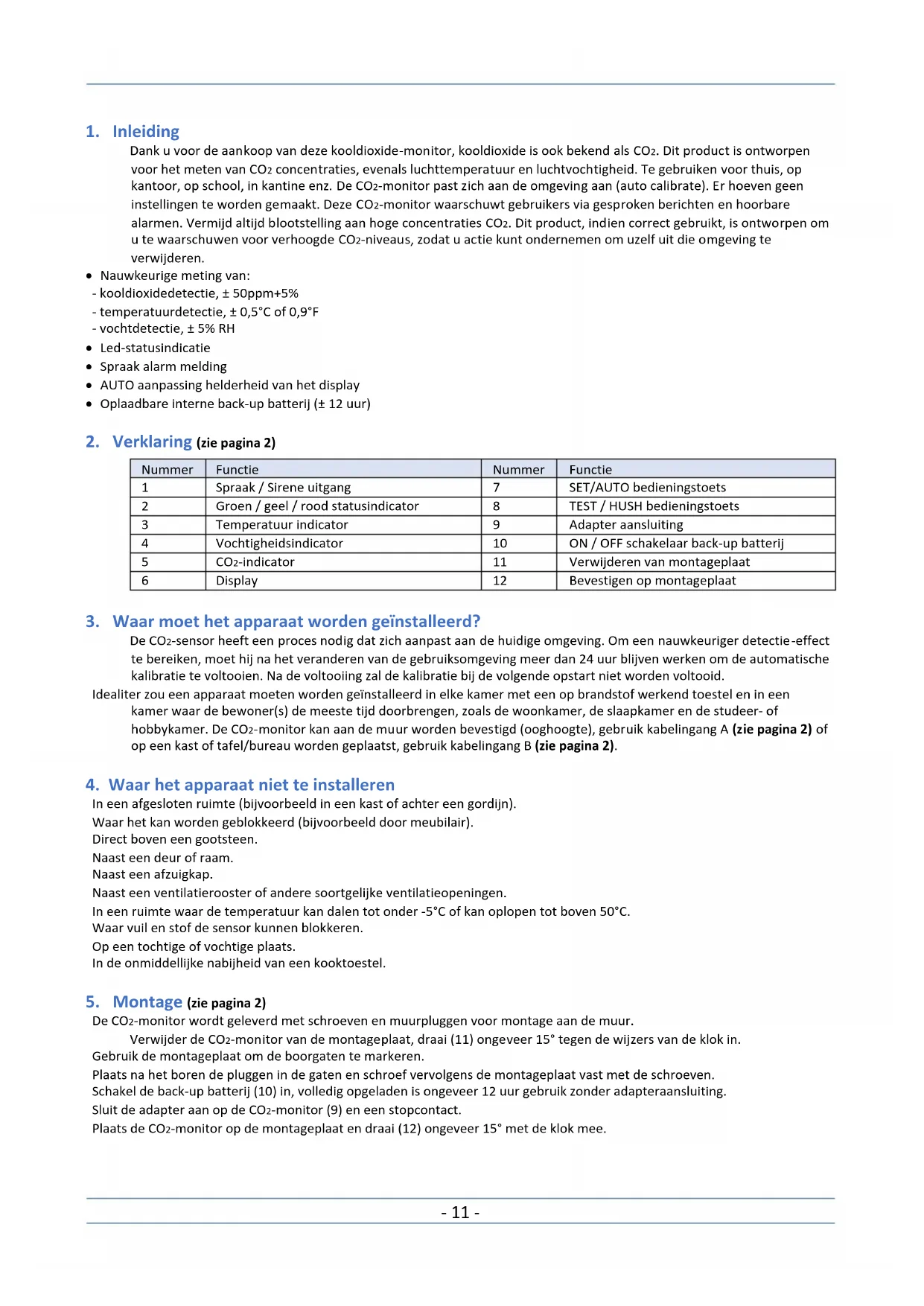 Dank u voor de aankoop van deze kooldioxide-monitor, kooldioxide is ook bekend als CO2. Dit product is ontworpen voor het meten van CO2 concentraties, evenals luchttemperatuur en luchtvochtigheid. Te gebruiken voor thuis, op kantoor, op school, in kantine enz. De CO2-monitor past zich aan de omgeving aan (auto calibrate). Er hoeven geen instellingen te worden gemaakt. Deze CO2-monitor waarschuwt gebruikers via gesproken berichten en hoorbare alarmen. Vermijd altijd blootstelling aan hoge concentraties CO2. Dit product, indien correct gebruikt, is ontworpen om u te waarschuwen voor verhoogde CO2-niveaus, zodat u actie kunt ondernemen om uzelf uit die omgeving te verwijderen.