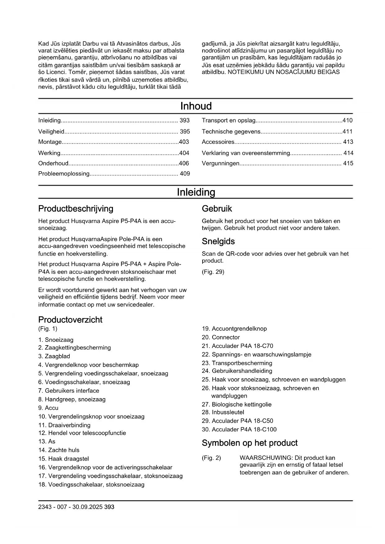 Symbolen op het product (Fig. 2) WAARSCHUWING: Dit product kan gevaarlijk zijn en ernstig of fataal letsel toebrengen aan de gebruiker of anderen. 2343 - 007 - 30.09.2025 393Wees voorzichtig en gebruik het product op de juiste manier. (Fig. 3) Lees de bedieningshandleiding zorgvuldig door en zorg dat u de instructies hebt begrepen voordat u het product gaat gebruiken. (Fig. 4) Gebruik goedgekeurde oogbescherming. (Fig. 5) Gebruik een veiligheidshelm op locaties waar objecten op u kunnen vallen. Gebruik goedgekeurde gehoorbescherming. Gebruik goedgekeurde oogbescherming. (Fig. 6) Draag goedgekeurde veiligheidshandschoenen. (Fig. 7) Gebruik antisliplaarzen voor zwaar gebruik. (Fig. 8) Gelijkstroom. (Fig. 9) Nominale spanning, V (Fig. 10) Stel het product niet bloot aan regen. (Fig. 11) Zaagkettingolie aanbrengen. (Fig. 12) Rotatierichting, zaagketting. (Fig. 13) Risico op letsel. Houd handen uit de buurt van de zaagketting. (Fig. 14) Draai naar links om de knop los te maken, draai naar rechts om de knop vast te draaien. (Fig. 15) Het product voldoet aan de geldende EU- richtlijnen. (Fig. 16) Geluidsemissies naar het omgevingslabel volgens de wetgeving van de EU en van Nieuw-Zuid-Wales "Protection of the Environment Operations (Noise Control) Regulation 2017". Het gegarandeerde geluidsvermogensniveau van het product staat in de Technische gegevens op pagina Technische gegevens op pagina