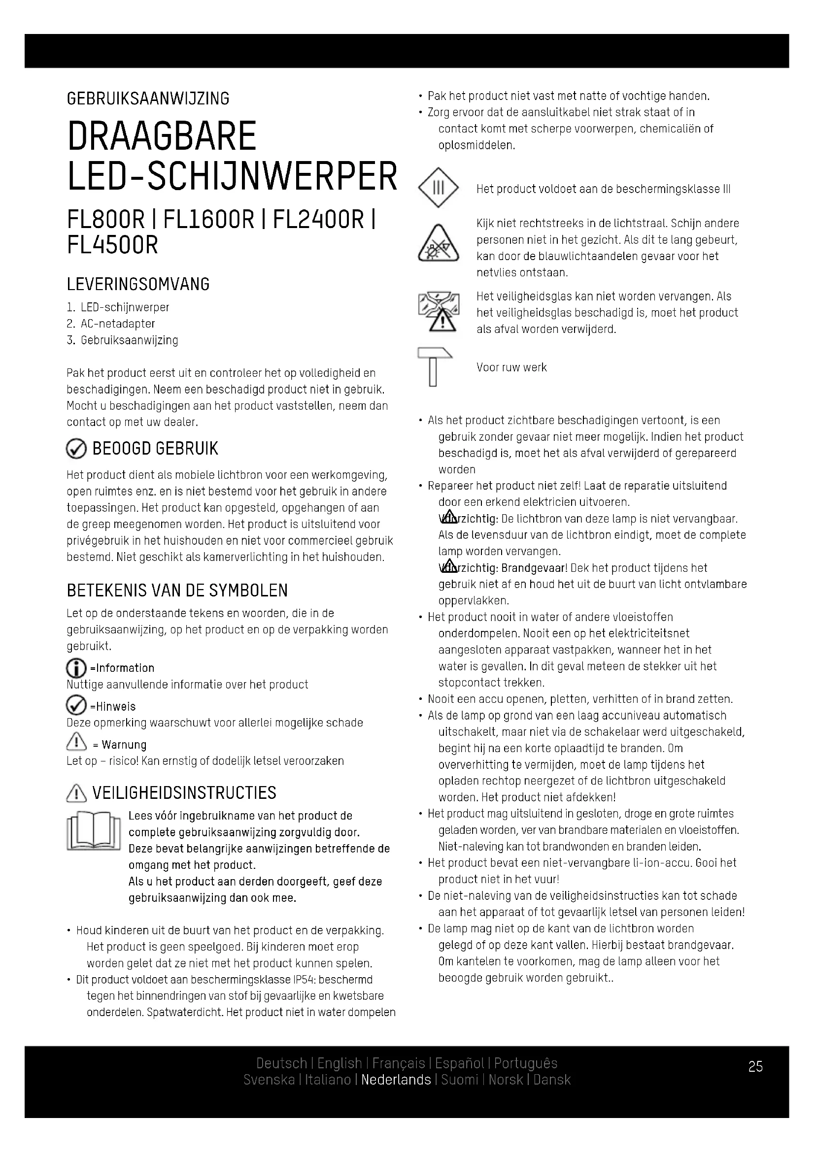 - De lamp mag niet op de kant van de lichtbron worden gelegd of op deze kant vallen. Hierbij bestaat brandgevaar. Om kantelen te voorkomen, mag de lamp alleen voor het beoogde gebruik worden gebruikt..Deutsch | English | Français | Español | Português Svenska | Italiano | Nederlands | Suomi | Norsk | Dansk