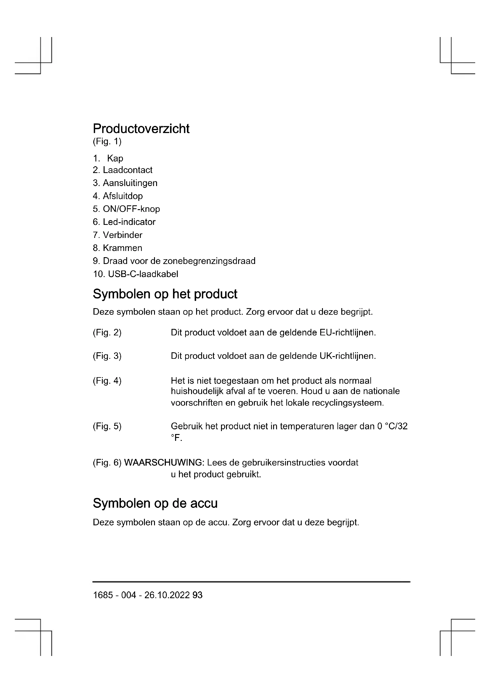 Symbolen op het product Deze symbolen staan op het product. Zorg ervoor dat u deze begrijpt. (Fig. 2) Dit product voldoet aan de geldende EU-richtlijnen. (Fig. 3) Dit product voldoet aan de geldende UK-richtlijnen. (Fig. 4) Het is niet toegestaan om het product als normaal huishoudelijk afval af te voeren. Houd u aan de nationale voorschriften en gebruik het lokale recyclingsysteem. (Fig. 5) Gebruik het product niet in temperaturen lager dan 0 °C/32 °F. (Fig. 6) WAARSCHUWING: Lees de gebruikersinstructies voordat u het product gebruikt. Symbolen op de accu Deze symbolen staan op de accu. Zorg ervoor dat u deze begrijpt. 1685 - 004 - 26.10.2022 93(Fig. 7) WAARSCHUWING: Gooi de accu niet bij het huishoudelijk afval. De accu bevat lithium-ion-cellen. Veiligheid Veiligheidsdefinities Waarschuwingen, voorzorgsmaatregelen en opmerkingen worden gebruikt om te wijzen op belangrijke delen van de handleiding. WAARSCHUWING: Wordt gebruikt om te wijzen op de kans op ernstig of fataal letsel voor de gebruiker of omstanders wanneer de instructies in de handleiding niet worden gevolgd. OPGELET: Wordt gebruikt indien er een risico bestaat op schade aan het product en andere eigendommen of aan de omgeving wanneer de instructies in de handleiding niet worden gevolgd. Let op: Geven verdere informatie die nodig is in een bepaalde situatie. Veiligheidsinstructies voor bediening WAARSCHUWING: Lees de volgende waarschuwingen voordat u het product gaat gebruiken.