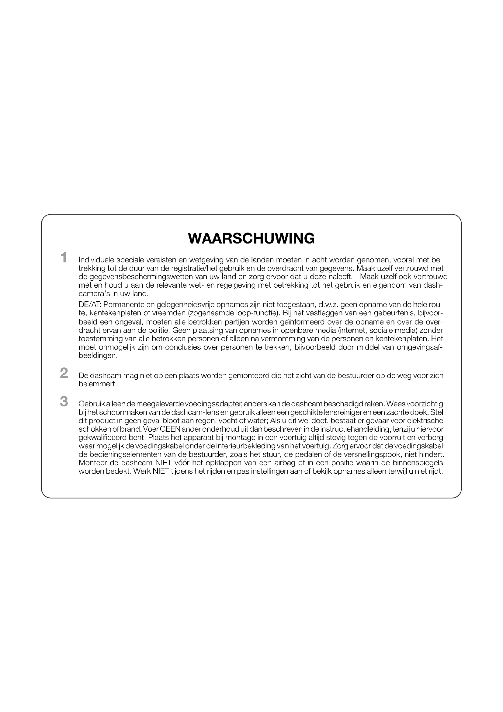 Individuele speciale vereisten en wetgeving van de landen moeten in acht worden genomen, vooral met be- trekking tot de duur van de registratie/het gebruik en de overdracht van gegevens. Maak uzelf vertrouwd met de gegevensbeschermingswetten van uw land en zorg ervoor dat u deze naleeft. Maak uzelf ook vertrouwd met en houd u aan de relevante wet- en regelgeving met betrekking tot het gebruik en eigendom van dash- camera's in uw land. DE/AT: Permanente en gelegenheidsvrije opnames zijn niet toegestaan, d.w.z. geen opname van de hele rou- te, kentekenplaten of vreemden (zogenaamde loop-functie). Bij het vastleggen van een gebeurtenis, bijvoor- beeld een ongeval, moeten alle betrokken partijen worden geïnformeerd over de opname en over de over- dracht ervan aan de politie. Geen plaatsing van opnames in openbare media (internet, sociale media) zonder toestemming van alle betrokken personen of alleen na vermomming van de personen en kentekenplaten. Het moet onmogelijk zijn om conclusies over personen te trekken, bijvoorbeeld door middel van omgevingsaf- beeldingen.