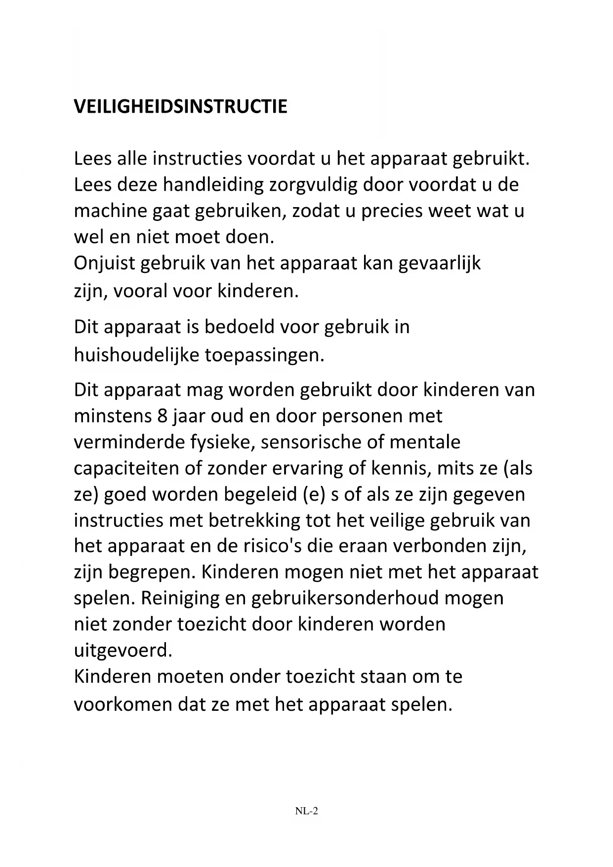 Lees alle instructies voordat u het apparaat gebruikt. Lees deze handleiding zorgvuldig door voordat u de machine gaat gebruiken, zodat u precies weet wat u wel en niet moet doen. Onjuist gebruik van het apparaat kan gevaarlijk zijn, vooral voor kinderen. Dit apparaat is bedoeld voor gebruik in huishoudelijke toepassingen. Dit apparaat mag worden gebruikt door kinderen van minstens 8 jaar oud en door personen met verminderde fysieke, sensorische of mentale capaciteiten of zonder ervaring of kennis, mits ze (als ze) goed worden begeleid (e) s of als ze zijn gegeven instructies met betrekking tot het veilige gebruik van het apparaat en de risico's die eraan verbonden zijn, zijn begrepen. Kinderen mogen niet met het apparaat spelen. Reiniging en gebruikersonderhoud mogen niet zonder toezicht door kinderen worden uitgevoerd. Kinderen moeten onder toezicht staan om te voorkomen dat ze met het apparaat spelen.NL-3