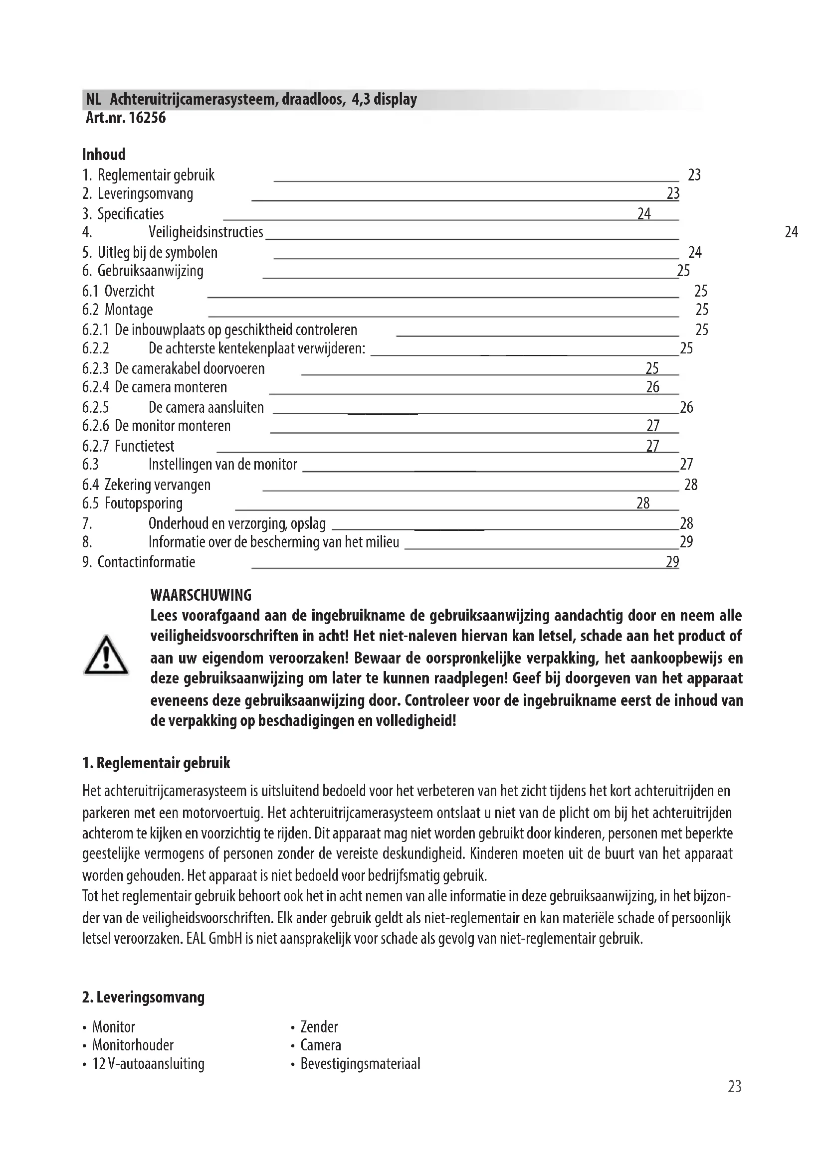 Het achteruitrijcamerasysteem is uitsluitend bedoeld voor het verbeteren van het zicht tijdens het kort achteruitrijden en parkeren met een motorvoertuig. Het achteruitrijcamerasysteem ontslaat u niet van de plicht om bij het achteruitrijden achterom te kijken en voorzichtig te rijden. Dit apparaat mag niet worden gebruikt door kinderen, personen met beperkte geestelijke vermogens of personen zonder de vereiste deskundigheid. Kinderen moeten uit de buurt van het apparaat worden gehouden. Het apparaat is niet bedoeld voor bedrijfsmatig gebruik. Tot het reglementair gebruik behoort ook het in acht nemen van alle informatie in deze gebruiksaanwijzing, in het bijzon- der van de veiligheidsvoorschriften. Elk ander gebruik geldt als niet-reglementair en kan materiële schade of persoonlijk letsel veroorzaken. EAL GmbH is niet aansprakelijk voor schade als gevolg van niet-reglementair gebruik.
