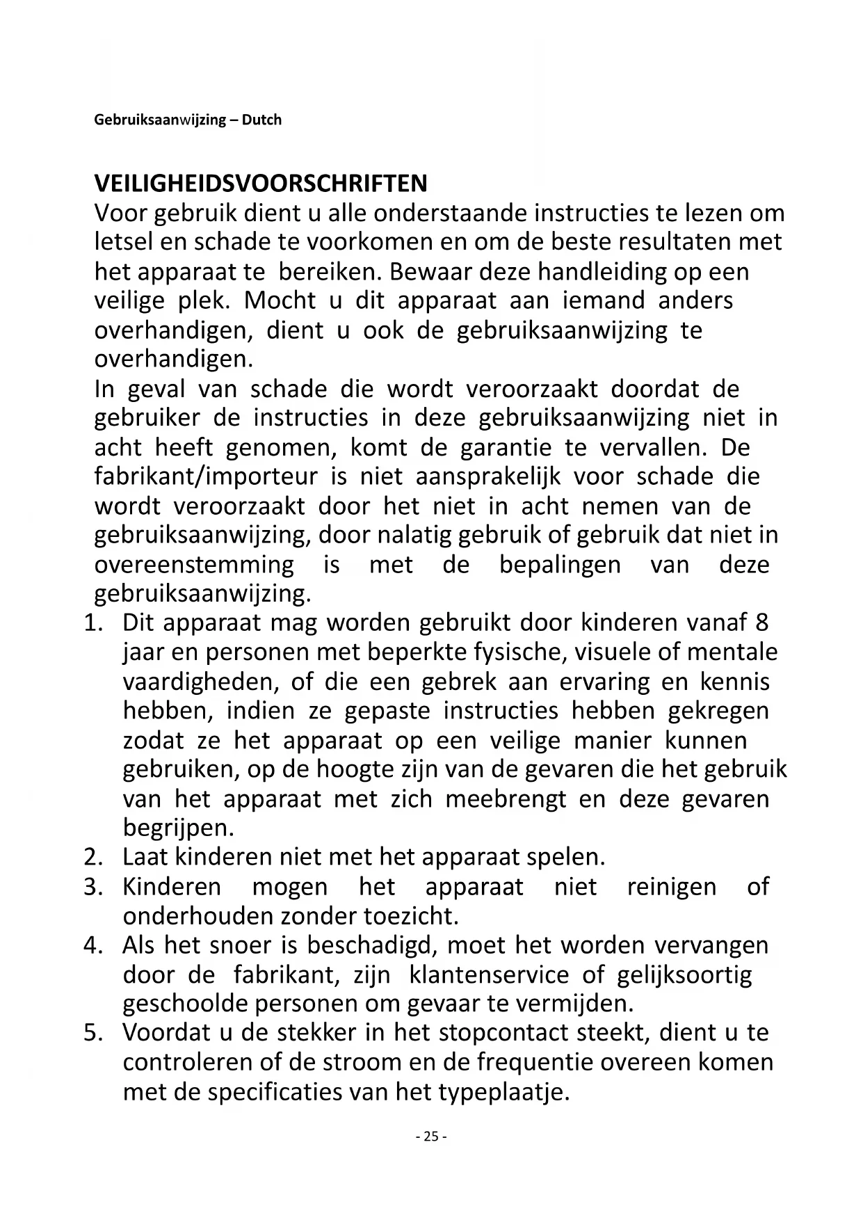 För information till kunden för hur man installerar, använder och underhåller produkten, WEEE- information, vänligen kontrollera bruksanvisningen som är inkluderad i förpackningen.- 25 - Gebruiksaanwijzing – Dutch VEILIGHEIDSVOORSCHRIFTEN Voor gebruik dient u alle onderstaande instructies te lezen om letsel en schade te voorkomen en om de beste resultaten met het apparaat te bereiken. Bewaar deze handleiding op een veilige plek. Mocht u dit apparaat aan iemand anders overhandigen, dient u ook de gebruiksaanwijzing te overhandigen. In geval van schade die wordt veroorzaakt doordat de gebruiker de instructies in deze gebruiksaanwijzing niet in acht heeft genomen, komt de garantie te vervallen. De fabrikant/importeur is niet aansprakelijk voor schade die wordt veroorzaakt door het niet in acht nemen van de gebruiksaanwijzing, door nalatig gebruik of gebruik dat niet in overeenstemming is met de bepalingen van deze gebruiksaanwijzing.