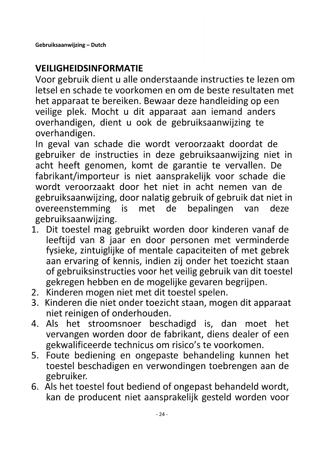 Gebruiksaanwijzing – Dutch VEILIGHEIDSINFORMATIE Voor gebruik dient u alle onderstaande instructies te lezen om letsel en schade te voorkomen en om de beste resultaten met het apparaat te bereiken. Bewaar deze handleiding op een veilige plek. Mocht u dit apparaat aan iemand anders overhandigen, dient u ook de gebruiksaanwijzing te overhandigen. In geval van schade die wordt veroorzaakt doordat de gebruiker de instructies in deze gebruiksaanwijzing niet in acht heeft genomen, komt de garantie te vervallen. De fabrikant/importeur is niet aansprakelijk voor schade die wordt veroorzaakt door het niet in acht nemen van de gebruiksaanwijzing, door nalatig gebruik of gebruik dat niet in overeenstemming is met de bepalingen van deze gebruiksaanwijzing.