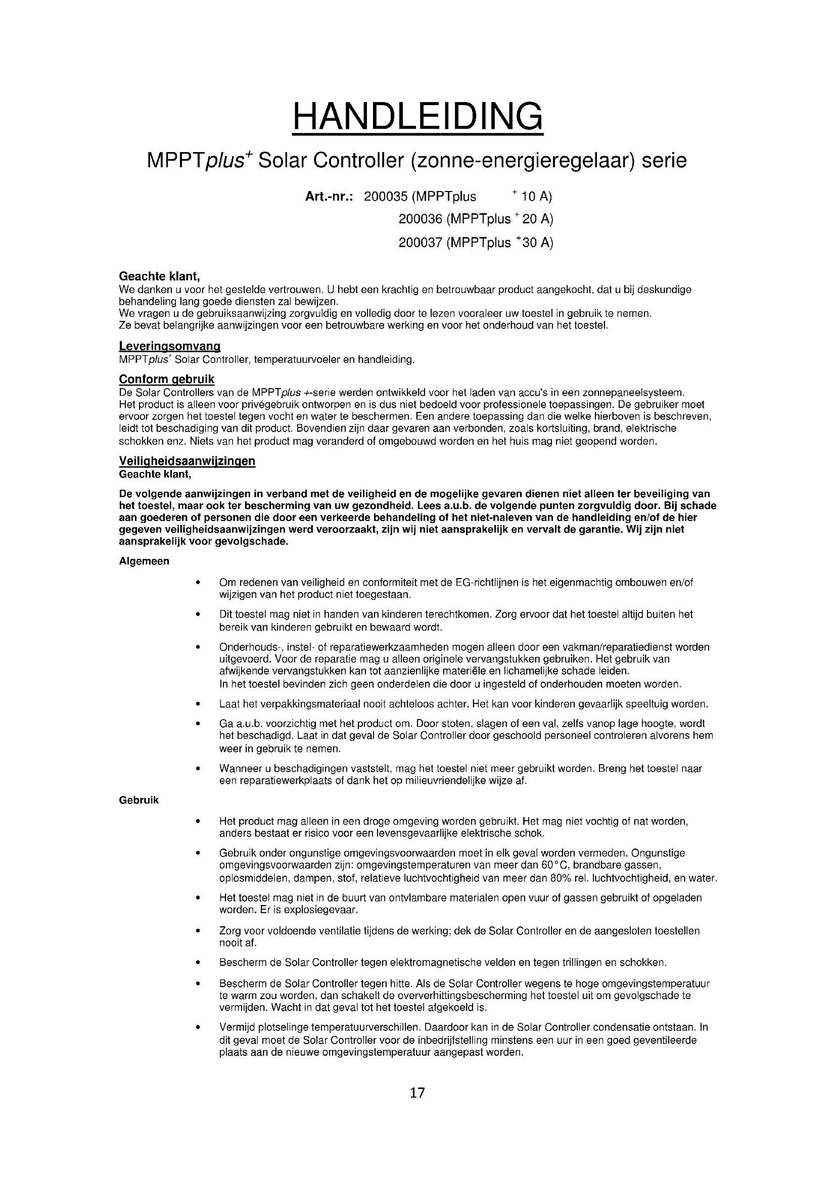 30 A) Geachte klant, We danken u voor het gestelde vertrouwen. U hebt een krachtig en betrouwbaar product aangekocht, dat u bij deskundige behandeling lang goede diensten zal bewijzen. We vragen u de gebruiksaanwijzing zorgvuldig en volledig door te lezen vooraleer uw toestel in gebruik te nemen. Ze bevat belangrijke aanwijzingen voor een betrouwbare werking en voor het onderhoud van het toestel. Leveringsomvang MPPTplus Solar Controller, temperatuurvoeler en handleiding. Conform gebruik De Solar Controllers van de MPPTplus +-serie werden ontwikkeld voor het laden van accu's in een zonnepaneelsysteem. Het product is alleen voor privégebruik ontworpen en is dus niet bedoeld voor professionele toepassingen. De gebruiker moet ervoor zorgen het toestel tegen vocht en water te beschermen. Een andere toepassing dan die welke hierboven is beschreven, leidt tot beschadiging van dit product. Bovendien zijn daar gevaren aan verbonden, zoals kortsluiting, brand, elektrische schokken enz. Niets van het product mag veranderd of omgebouwd worden en het huis mag niet geopend worden. Veiligheidsaanwijzingen Geachte klant, De volgende aanwijzingen in verband met de veiligheid en de mogelijke gevaren dienen niet alleen ter beveiliging van het toestel, maar ook ter bescherming van uw gezondheid. Lees a.u.b. de volgende punten zorgvuldig door. Bij schade aan goederen of personen die door een verkeerde behandeling of het niet-naleven van de handleiding en/of de hier gegeven veiligheidsaanwijzingen werd veroorzaakt, zijn wij niet aansprakelijk en vervalt de garantie. Wij zijn niet aansprakelijk voor gevolgschade. Algemeen
