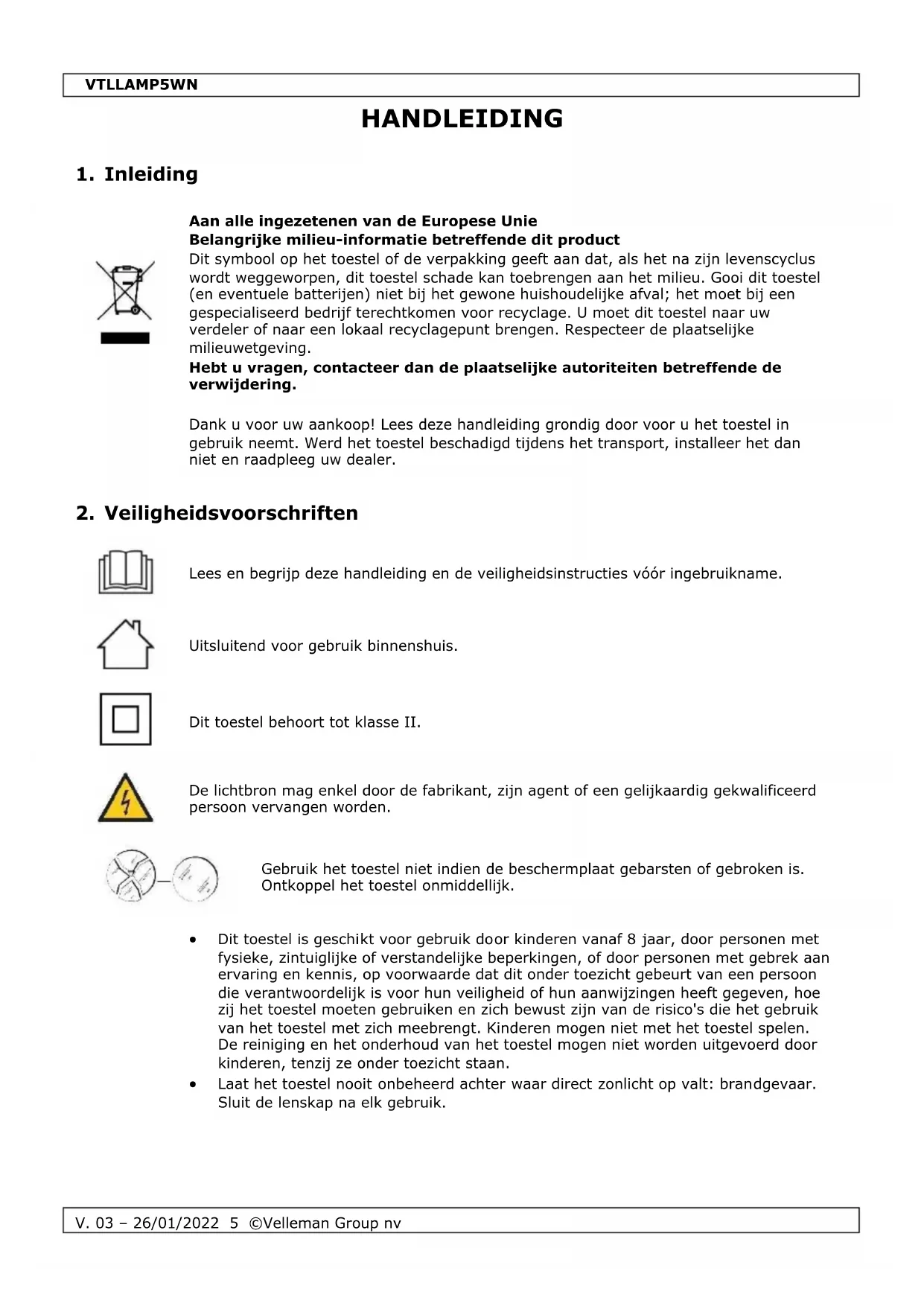 Vind de handleiding van het apparaat gratis VTLLAMP5WN VELLEMAN in PDF-formaat.