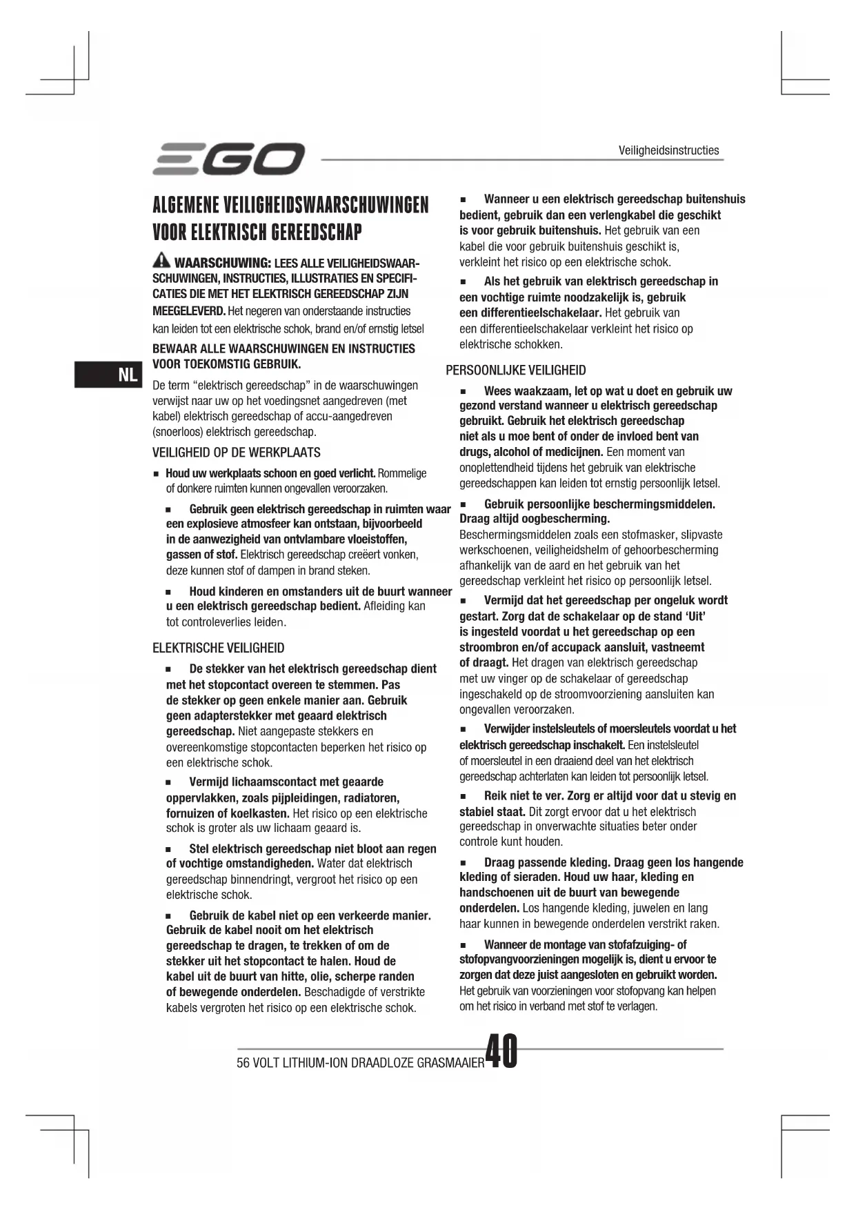 ◾ Draag altijd een veiligheidsbril of werkbril om tijdens het gebruik en als u instellingen of reparaties uitvoert uw ogen te beschermen. Weggegooide objecten die terugkaatsen kunnen ernstig letsel aan de ogen veroorzaken. Gebruik altijd een gezichts- of stofmasker wanneer u in een stoffige omgeving werkt. ◾ Draag gepaste kleding - Draag geen loshangende kleding of juwelen. Deze kunnen in de bewegende onderdelen vast komen te zitten. Rubber handschoenen en stevig schoeisel worden aanbevolen wanneer u buitenshuis werkt. Draag stevig schoeisel met ruwe zool en strak zittende broeken en shirts. Aanbevolen worden shirts en broeken die de armen en benen bedekken en schoenen met stalen neuzen. Gebruik dit gereedschap nooit blootsvoets, met sandalen, met wegglijdende of lichtgewicht (bijv. canvas) schoenen. ◾ Houd uw handen en voeten uit de buurt van de draaiende onderdelen en de messen. Contact met de messen kan letsel aan handen en voeten veroorzaken. ◾ Een missende of beschadigde afdekking van de afvoer kan contact met de messen en hierdoor letsel door weggeslingerde voorwerpen veroorzaken. ◾ Veelvuldig letsel ontstaat als de grasmaaier wordt teruggetrokken en hierbij de voet raakt, als men valt ten gevolg van uitglijden of struikelen. Houd de grasmaaier niet vast als u valt; laat het handvat direct los. ◾ Trek de grasmaaier nooit terug als u wandelt. Als u de grasmaaier naar achteren moet bewegen, weg van een wand of obstructie, dient u eerst naar beneden en achterom te kijken om te voorkomen dat u ergens over struikelt en de volgende stappen in acht te nemen: ◾ Ga met volledig gestrekte armen naar achteren. ◾ Zorg er voor dat u stevig staat. ◾ Trek de grasmaaier langzaam terug, niet meer dan de helft in uw richting. ◾ Herhaal deze stappen indien nodig. ◾ Gebruik de grasmaaier niet als u onder de invloed van alcohol of drugs bent. ◾ Blijf aandachtig – let op wat u doet. Gebruik uw gezond verstand. Gebruik de grasmaaier niet als u moe bent. ◾ De motor/mes-bedieningshandvat is een veiligheidsvoorziening. Probeer deze voorziening niet te overbruggen. Door dit te doen wordt de veiligheidsvoorziening onbruikbaar wat in persoonlijk letsel met het roterende mes kan leiden. De motor/ mes-bedieningshandvat moet makkelijk in beide richtingen bediend kunnen worden en automatisch in de uitgangspositie gaan als hij wordt losgelaten. ◾ Vermijd gevaarlijke omgevingen – Gebruik de grasmaaier niet in een vochtige of natte omgeving. ◾ Gebruik de machine niet als het regent. ◾ Let altijd op uw houding. Uitglijden en vallen kan ernstig persoonlijk letsel veroorzaken. Als u het gevoel heeft, uw evenwicht te verliezen, dient u de motor/ mes-bedieningshandvat direct los te laten, waarna het mes binnen drie seconden stopt met draaien. ◾ Stop het mes als u over grindpaden, stoepen of wegen loopt. ◾ Als het gereedschap abnormaal trilt, stop de motor en zoek onmiddellijk naar de oorzaak. Trilling wijst vaak op een storing. ◾ Controleer op beschadigingen; ◾ Vervang of repareer beschadigde onderdelen die door de gebruiker kunnen worden vervangen; ◾ Controleer op losse onderdelen en draai deze vast. ◾ Gebruik de grasmaaier nooit zonder correct geïnstalleerd sleepscherm, afdekking, opvangzak, mulch-invoer, zijkoker, motor/mes- bedieningshandvat of de gemonteerde en werkende veiligheidsvoorzieningen. Gebruik de grasmaaier nooit met beschadigde veiligheidsvoorzieningen. Anders kan dit leiden tot persoonlijk letsel. ◾ Als er zich situaties voordoen die niet in deze handleiding zijn behandeld, gebruik uw gezond verstand. Neem contact op met het EGO klantenservicecentrum voor bijstand. ◾ Haal het accupack uit het gereedschap alvorens het gereedschap af te danken. ◾ Gooi het accupack op een veilige manier weg. GEBRUIK OP EEN HELLING: Hellingen zijn een belangrijke factor bij ongevallen waarbij men uitglijdt en valt. Deze kunnen in ernstig letsel resulteren. Let op uw houding als u het gereedschap op hellingen gebruikt. U dient extra alert te zijn als u het gereedschap op een helling gebruikt. Maai niet op een helling, als u zich niet op uw gemak voelt. Maai: ◾ De hellingen zijdelings; nooit naar boven en beneden. Wees erg voorzichtig als u van richting verandert op een helling. ◾ Let op gaten, sporen, stenen, verborgen voorwerpen, of bobbels die ertoe kunnen leiden dat u uitglijdt of struikelt. In hoog gras kunnen zich obstakels verbergen. Maai niet: ◾ In de buurt van afgronden, sloten of dijken; u kunt uw evenwicht verliezen en vallen. ◾ Maai geen hellingen van meer dan 15 graden. ◾ Als het gras nat is. Als een onstabiele stand ertoe kan leiden dat u uitglijdt.56 VOLT LITHIUM-ION DRAADLOZE GRASMAAIER 45