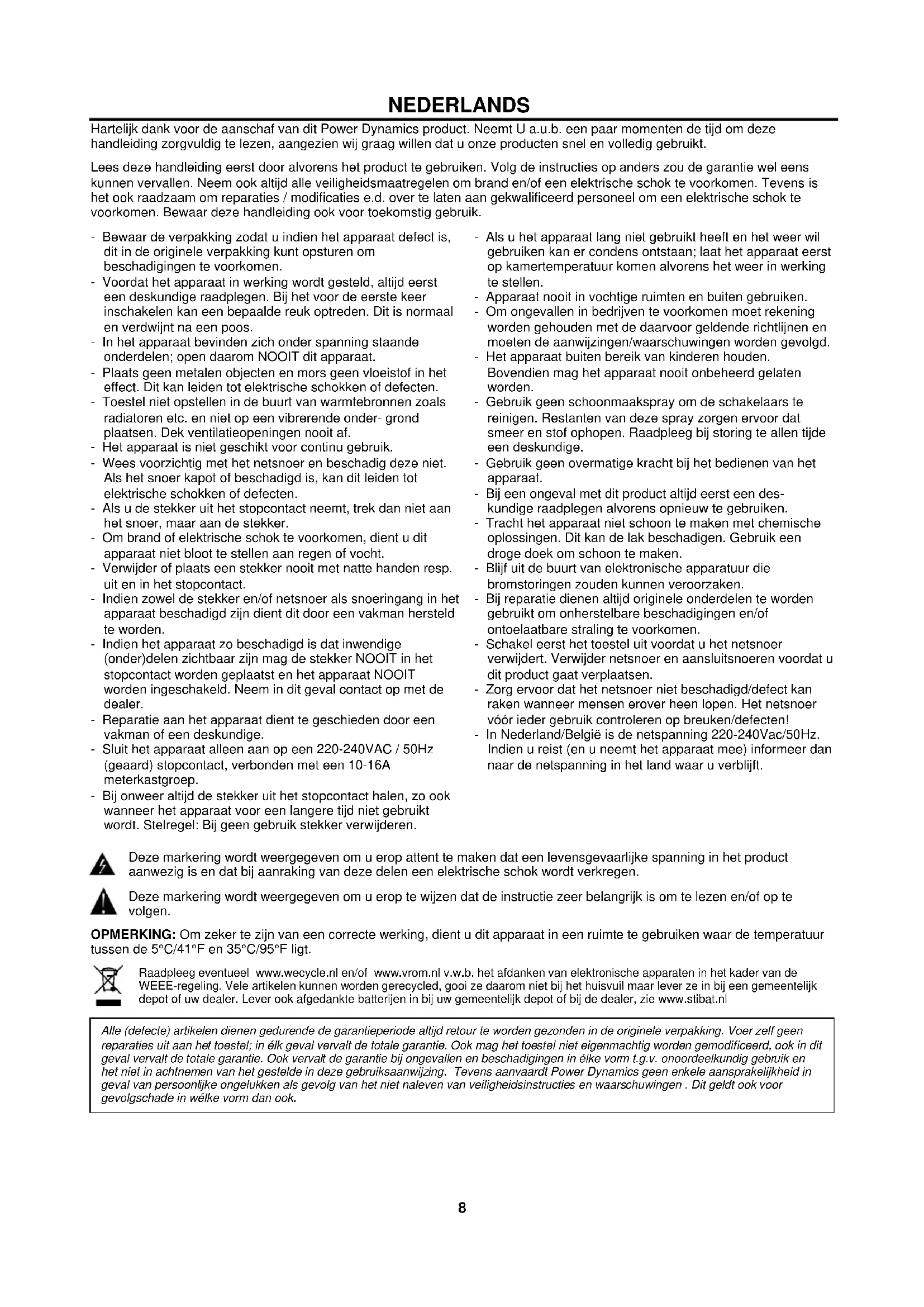 When connecting to- and using BT, make sure to adjust the BT antenna to a vertical position to ensure the best possible wireless signal.8 NEDERLANDS Hartelijk dank voor de aanschaf van dit Power Dynamics product. Neemt U a.u.b. een paar momenten de tijd om deze handleiding zorgvuldig te lezen, aangezien wij graag willen dat u onze producten snel en volledig gebruikt. Lees deze handleiding eerst door alvorens het product te gebruiken. Volg de instructies op anders zou de garantie wel eens kunnen vervallen. Neem ook altijd alle veiligheidsmaatregelen om brand en/of een elektrische schok te voorkomen. Tevens is het ook raadzaam om reparaties / modificaties e.d. over te laten aan gekwalificeerd personeel om een elektrische schok te voorkomen. Bewaar deze handleiding ook voor toekomstig gebruik. - Bewaar de verpakking zodat u indien het apparaat defect is, dit in de originele verpakking kunt opsturen om beschadigingen te voorkomen. - Voordat het apparaat in werking wordt gesteld, altijd eerst een deskundige raadplegen. Bij het voor de eerste keer inschakelen kan een bepaalde reuk optreden. Dit is normaal en verdwijnt na een poos. - In het apparaat bevinden zich onder spanning staande onderdelen; open daarom NOOIT dit apparaat. - Plaats geen metalen objecten en mors geen vloeistof in het effect. Dit kan leiden tot elektrische schokken of defecten. - Toestel niet opstellen in de buurt van warmtebronnen zoals radiatoren etc. en niet op een vibrerende onder- grond plaatsen. Dek ventilatieopeningen nooit af. - Het apparaat is niet geschikt voor continu gebruik. - Wees voorzichtig met het netsnoer en beschadig deze niet. Als het snoer kapot of beschadigd is, kan dit leiden tot elektrische schokken of defecten. - Als u de stekker uit het stopcontact neemt, trek dan niet aan het snoer, maar aan de stekker. - Om brand of elektrische schok te voorkomen, dient u dit apparaat niet bloot te stellen aan regen of vocht. - Verwijder of plaats een stekker nooit met natte handen resp. uit en in het stopcontact. - Indien zowel de stekker en/of netsnoer als snoeringang in het apparaat beschadigd zijn dient dit door een vakman hersteld te worden. - Indien het apparaat zo beschadigd is dat inwendige (onder)delen zichtbaar zijn mag de stekker NOOIT in het stopcontact worden geplaatst en het apparaat NOOIT worden ingeschakeld. Neem in dit geval contact op met de dealer. - Reparatie aan het apparaat dient te geschieden door een vakman of een deskundige. - Sluit het apparaat alleen aan op een 220-240VAC / 50Hz (geaard) stopcontact, verbonden met een 10-16A meterkastgroep. - Bij onweer altijd de stekker uit het stopcontact halen, zo ook wanneer het apparaat voor een langere tijd niet gebruikt wordt. Stelregel: Bij geen gebruik stekker verwijderen. - Als u het apparaat lang niet gebruikt heeft en het weer wil gebruiken kan er condens ontstaan; laat het apparaat eerst op kamertemperatuur komen alvorens het weer in werking te stellen. - Apparaat nooit in vochtige ruimten en buiten gebruiken. - Om ongevallen in bedrijven te voorkomen moet rekening worden gehouden met de daarvoor geldende richtlijnen en moeten de aanwijzingen/waarschuwingen worden gevolgd. - Het apparaat buiten bereik van kinderen houden. Bovendien mag het apparaat nooit onbeheerd gelaten worden. - Gebruik geen schoonmaakspray om de schakelaars te reinigen. Restanten van deze spray zorgen ervoor dat smeer en stof ophopen. Raadpleeg bij storing te allen tijde een deskundige. - Gebruik geen overmatige kracht bij het bedienen van het apparaat. - Bij een ongeval met dit product altijd eerst een des- kundige raadplegen alvorens opnieuw te gebruiken. - Tracht het apparaat niet schoon te maken met chemische oplossingen. Dit kan de lak beschadigen. Gebruik een droge doek om schoon te maken. - Blijf uit de buurt van elektronische apparatuur die bromstoringen zouden kunnen veroorzaken. - Bij reparatie dienen altijd originele onderdelen te worden gebruikt om onherstelbare beschadigingen en/of ontoelaatbare straling te voorkomen. - Schakel eerst het toestel uit voordat u het netsnoer verwijdert. Verwijder netsnoer en aansluitsnoeren voordat u dit product gaat verplaatsen. - Zorg ervoor dat het netsnoer niet beschadigd/defect kan raken wanneer mensen erover heen lopen. Het netsnoer vóór ieder gebruik controleren op breuken/defecten! - In Nederland/België is de netspanning 220-240Vac/50Hz. Indien u reist (en u neemt het apparaat mee) informeer dan naar de netspanning in het land waar u verblijft.