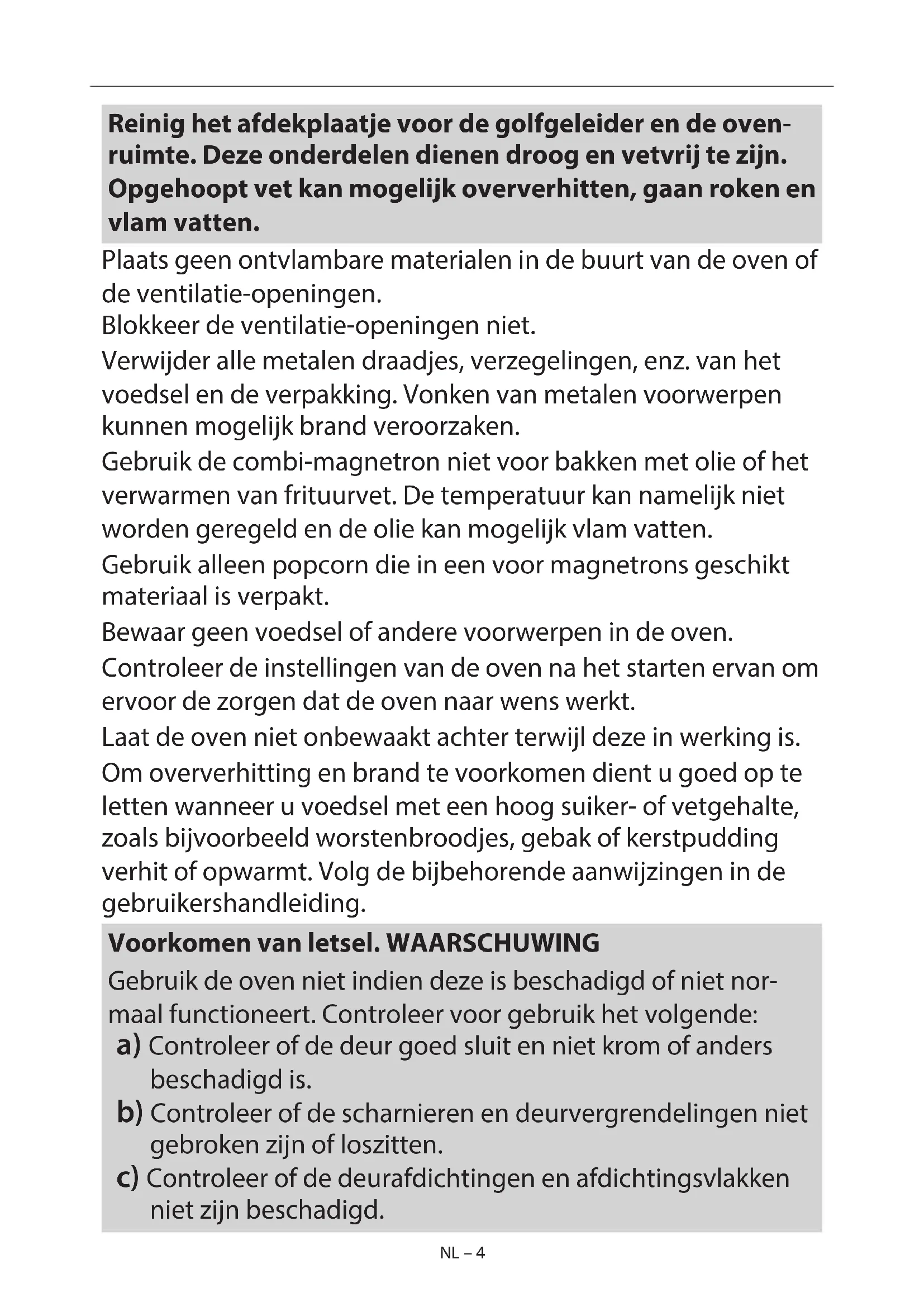 - Zorg dat er geen vloeisto en of andere voorwerpen in de openingen van de deurvergrendelingen of ventilatie-ope- NL – 4 NL – 4 Reinig het afdekplaatje voor de golfgeleider en de oven- ruimte. Deze onderdelen dienen droog en vetvrij te zijn. Opgehoopt vet kan mogelijk oververhitten, gaan roken en vlam vatten. Plaats geen ontvlambare materialen in de buurt van de oven of de ventilatie-openingen. Blokkeer de ventilatie-openingen niet. Verwijder alle metalen draadjes, verzegelingen, enz. van het voedsel en de verpakking. Vonken van metalen voorwerpen kunnen mogelijk brand veroorzaken. Gebruik de combi-magnetron niet voor bakken met olie of het verwarmen van frituurvet. De temperatuur kan namelijk niet worden geregeld en de olie kan mogelijk vlam vatten. Gebruik alleen popcorn die in een voor magnetrons geschikt materiaal is verpakt. Bewaar geen voedsel of andere voorwerpen in de oven. Controleer de instellingen van de oven na het starten ervan om ervoor de zorgen dat de oven naar wens werkt. Laat de oven niet onbewaakt achter terwijl deze in werking is. Om oververhitting en brand te voorkomen dient u goed op te letten wanneer u voedsel met een hoog suiker- of vetgehalte, zoals bijvoorbeeld worstenbroodjes, gebak of kerstpudding verhit of opwarmt. Volg de bijbehorende aanwijzingen in de gebruikershandleiding. Voorkomen van letsel. WAARSCHUWING Gebruik de oven niet indien deze is beschadigd of niet nor- maal functioneert. Controleer voor gebruik het volgende: a) Controleer of de deur goed sluit en niet krom of anders beschadigd is. b) Controleer of de scharnieren en deurvergrendelingen niet gebroken zijn of loszitten. c) Controleer of de deurafdichtingen en afdichtingsvlakken niet zijn beschadigd.NL NL – 5 NL – 5 d) Controleer of er geen deuken in de ovenruimte of in de deur zitten. e) Controleer of het netsnoer en de stekker niet beschadigd zijn. Als de deur of de afdichtingen beschadigd zijn, mag de oven niet gebruikt worden totdat hij door een vakman is gerepa- reerd. Nooit zelf aanpassingen, veranderingen of reparaties aan de oven uitvoeren. Niemand, behalve een gekwali ceerde technicus, dient onderhouds- of reparatiewerkzaamheden uit te voeren waarbij een afdekking die bescherming biedt tegen blootstelling aan microgolven, wordt verwijderd. Dit kan gevaarlijk zijn. Gebruik de oven niet wanneer de deur openstaat en bewerk de vergrendingen van de deur niet. Gebruik de oven niet wanneer er zich een voorwerp tussen de deurafdichtingen en pasvlak- ken bevindt. Laat vet of vuil zich niet opbouwen op de deurafdichtin- gen of aangrenzende delen. Reinig de oven regelmatig en verwijder voedselresten. Volg de instructies voor “Onderhoud en reiniging”. Indien de oven niet naar behoren schoon wordt gehouden, kan dit leiden tot aantasting van het oppervlak. Dit kan dan weer leiden tot een verkorte levensduur van het apparaat en mogelijk tot gevaarlijke situaties. Personen met een PACEMAKER dienen een dokter of de fa- brikant van de pacemaker te raadplegen aangaande speciale voorzorgsmaatregelen bij gebruik van combi-magnetrons. Het voorkomen van de mogelijkheid van een elektrische schok.