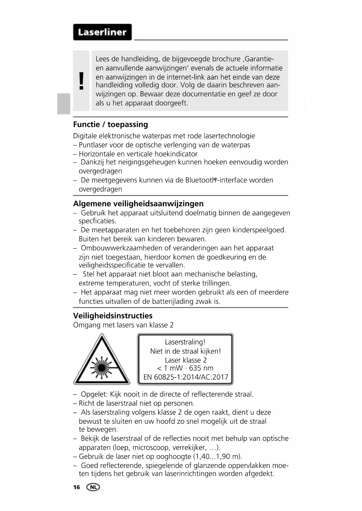 Calibration The measuring device must be calibrated and tested on a regular basis to ensure it is accurate and working properly. We recommend carrying out calibration once a year. Contact your distributor or the UMAREX-LASERLINER service department. Technical data Electronic measuring precision ± 0.05° at 0° … 1° ± 0.1° at 1° … 89° ± 0,05° at 89° … 90° Vial accuracy ± 0.5 mm/m Display accuracy 2 decimal places Laser wavelength 635 nm Laser class 2 / < 1 mW (EN 60825-1:2014/AC:2017) Power supply 2 x 1.5V LR03 (AAA) Operating time with laser: approx. 10 hours without laser: approx. 55 hours Radio module operating data Bluetooth LE 4.x interface; Frequency band: ISM band 2400–2483.5 MHz, 40 channels; Transmission power: max. 10mW; Bandwidth: 2 MHz; Bit rate: 1 Mbit/s; Modulation: GFSK/FHSS Operating conditions -10°C … 50°C, max. humidity 80% rH, no condensation, max. working altitude 2000 m above sea level Storage conditions -20°C … 70°C, max. humidity 80% rH Dimensions 40 400 x 63 x 33 mm (W x H x D) Dimensions 60 600 x 63 x 33 mm (W x H x D) Dimensions 80 800 x 63 x 33 mm (W x H x D) Dimensions 100 1000 x 63 x 33 mm (W x H x D) Dimensions 120 1200 x 63 x 33 mm (W x H x D) Weight 40/60/80/100/120 548 g / 722 g / 968 g / 1105 g / 1360 g (incl. batteries) Subject to technical change without notice. 20W36 EU directives and disposal This device complies with all necessary standards for the free movement of goods within the EU. This product is an electric device and must be collected separately for disposal according to the European Directive on waste electrical and electronic equipment. Further safety and supplementary notices at: http://laserliner.com/info?an=AHJ EN16 Veiligheidsinstructies Omgang met lasers van klasse 2 Algemene veiligheidsaanwijzingen – Gebruik het apparaat uitsluitend doelmatig binnen de aangegeven speccaties. – De meetapparaten en het toebehoren zijn geen kinderspeelgoed. Buiten het bereik van kinderen bewaren. – Ombouwwerkzaamheden of veranderingen aan het apparaat zijn niet toegestaan, hierdoor komen de goedkeuring en de veiligheidsspecicatie te vervallen. – Stel het apparaat niet bloot aan mechanische belasting, extreme temperaturen, vocht of sterke trillingen. – Het apparaat mag niet meer worden gebruikt als een of meerdere functies uitvallen of de batterijlading zwak is. – Opgelet: Kijk nooit in de directe of reecterende straal. – Richt de laserstraal niet op personen. – Als laserstraling volgens klasse 2 de ogen raakt, dient u deze bewust te sluiten en uw hoofd zo snel mogelijk uit de straal te bewegen. – Bekijk de laserstraal of de reecties nooit met behulp van optische apparaten (loep, microscoop, verrekijker, …). – Gebruik de laser niet op ooghoogte (1,40...1,90 m). – Goed reecterende, spiegelende of glanzende oppervlakken moe- ten tijdens het gebruik van laserinrichtingen worden afgedekt. Laserstraling! Niet in de straal kijken! Laser klasse 2 < 1 mW · 635 nm EN 60825-1:2014/AC:2017 Digitale elektronische waterpas met rode lasertechnologie – Puntlaser voor de optische verlenging van de waterpas – Horizontale en verticale hoekindicator – Dankzij het neigingsgeheugen kunnen hoeken eenvoudig worden overgedragen – De meetgegevens kunnen via de Bluetooth