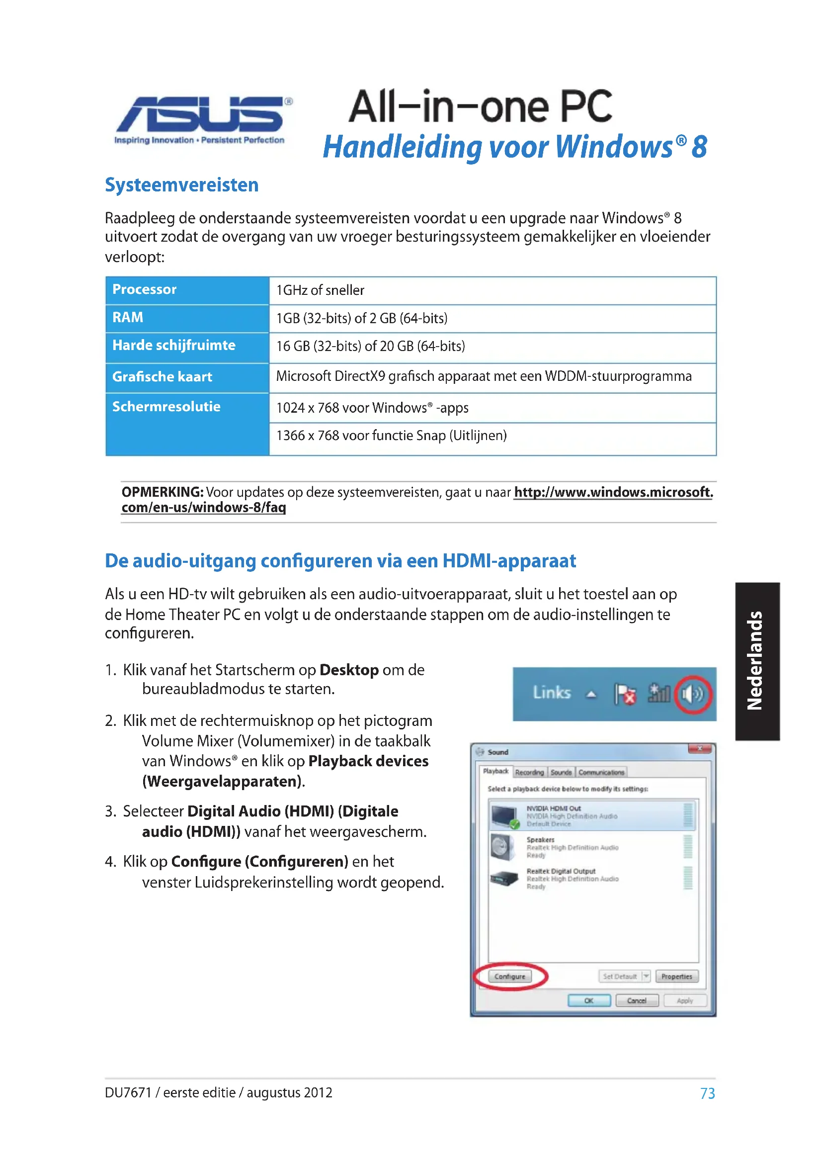 venster Luidsprekerinstelling wordt geopend. OPMERKING: Voor updates op deze systeemvereisten, gaat u naar http://www.windows.microsoft. com/en-us/windows-8/faq Processor 1GHz of sneller RAM 1GB (32-bits) of 2 GB (64-bits) Harde schijfruimte 16 GB (32-bits) of 20 GB (64-bits) Grasche kaart Microsoft DirectX9 grasch apparaat met een WDDM-stuurprogramma Schermresolutie 1024 x 768 voor Windows® -apps 1366 x 768 voor functie Snap (Uitlijnen) Systeemvereisten Raadpleeg de onderstaande systeemvereisten voordat u een upgrade naar Windows® 8 uitvoert zodat de overgang van uw vroeger besturingssysteem gemakkelijker en vloeiender verloopt: Nederlands DU7671 / eerste editie / augustus 201274 Nederlands