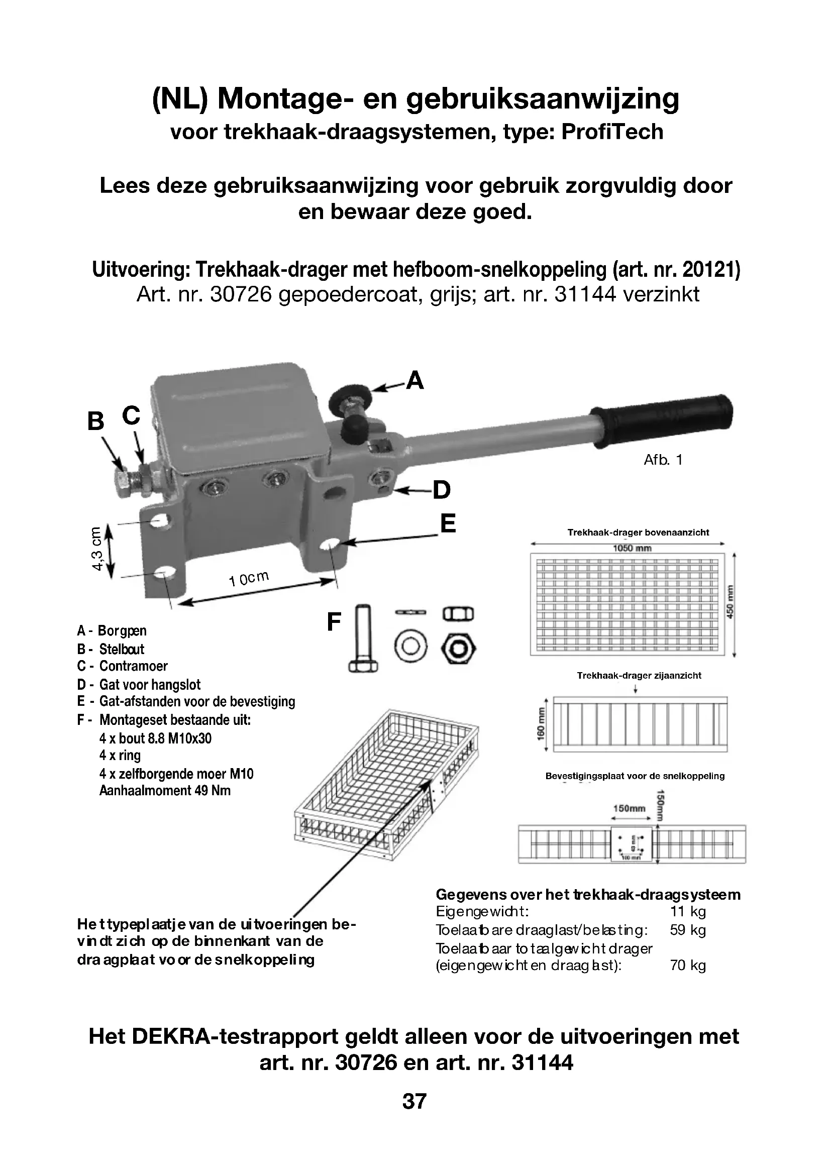 Het DEKRA-testrapport geldt alleen voor de uitvoeringen met art. nr. 30726 en art. nr. 31144