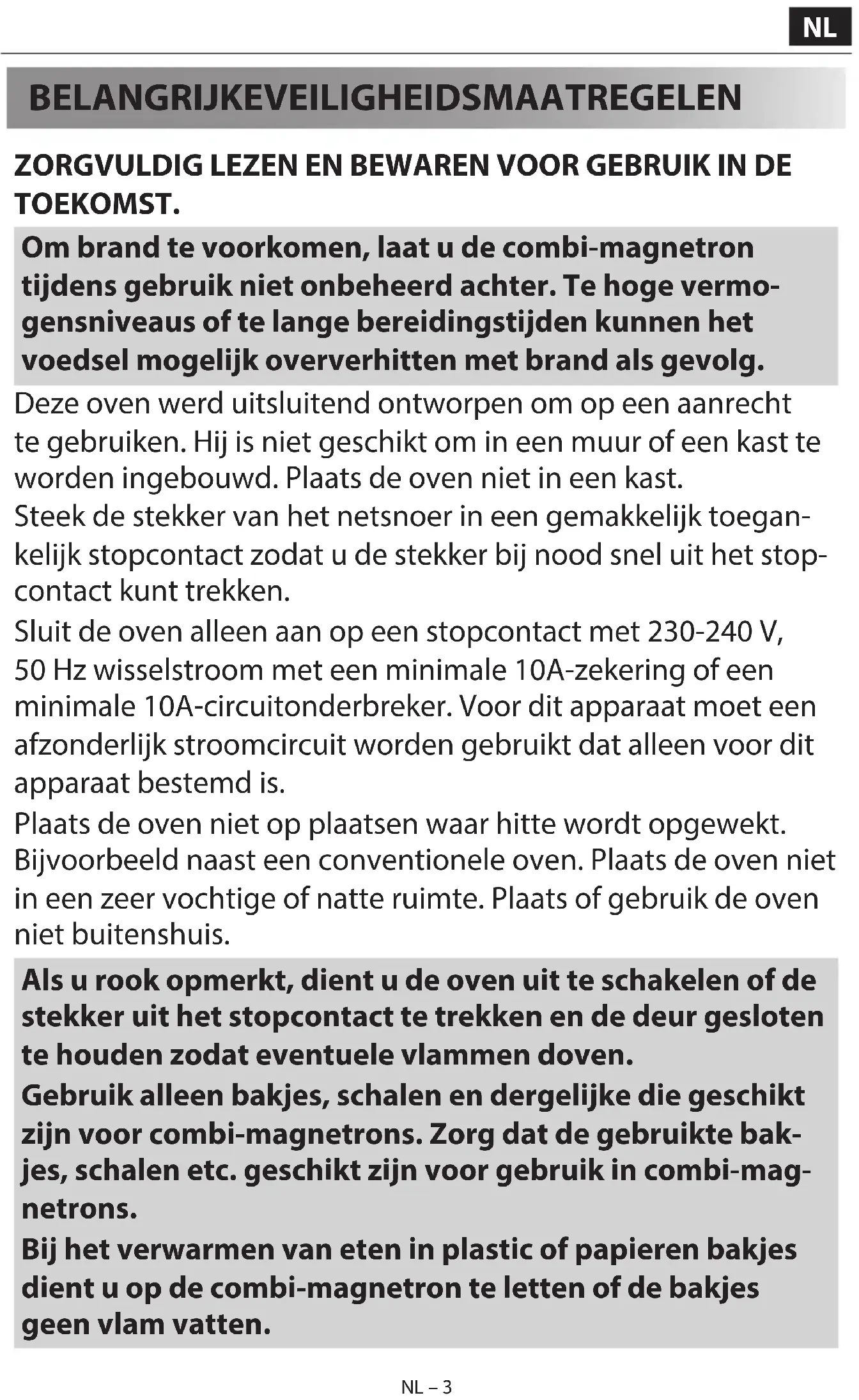 - Kontroller at døren er sikkert lukket og tar i bruk dørens sikkerhetslåsesystem. Ellers vil mikrobølgeenergien ikke yte inn i ovnen. HVIS INGEN AV DE OVENNEVNTE FORSLAGENE LØSER PROBLEMET, KAN DU TA KONTAKT MED EN KVALIFISERT TEKNIKER. IKKE PRØV Å JUSTERE ELLER REPARERE OVNEN SELV.NL – 3NL – 3 BELANGRIJKE VEILIGHEIDSMAATREGELEN ZORGVULDIG LEZEN EN BEWAREN VOOR GEBRUIK IN DE TOEKOMST. Om brand te voorkomen, laat u de combi-magnetron tijdens gebruik niet onbeheerd achter. Te hoge vermo- gensniveaus of te lange bereidingstijden kunnen het voedsel mogelijk oververhitten met brand als gevolg. Deze oven werd uitsluitend ontworpen om op een aanrecht te gebruiken. Hij is niet geschikt om in een muur of een kast te worden ingebouwd. Plaats de oven niet in een kast. Steek de stekker van het netsnoer in een gemakkelijk toegan- kelijk stopcontact zodat u de stekker bij nood snel uit het stop- contact kunt trekken. Sluit de oven alleen aan op een stopcontact met 230-240V, 50Hz wisselstroom met een minimale 10A-zekering of een minimale 10A-circuitonderbreker. Voor dit apparaat moet een afzonderlijk stroomcircuit worden gebruikt dat alleen voor dit apparaat bestemd is. Plaats de oven niet op plaatsen waar hitte wordt opgewekt. Bijvoorbeeld naast een conventionele oven. Plaats de oven niet in een zeer vochtige of natte ruimte. Plaats of gebruik de oven niet buitenshuis. Als u rook opmerkt, dient u de oven uit te schakelen of de stekker uit het stopcontact te trekken en de deur gesloten te houden zodat eventuele vlammen doven. Gebruik alleen bakjes, schalen en dergelijke die geschikt zijn voor combi-magnetrons. Zorg dat de gebruikte bak- jes, schalen etc. geschikt zijn voor gebruik in combi-mag- netrons. Bij het verwarmen van eten in plastic of papieren bakjes dient u op de combi-magnetron te letten of de bakjes geen vlam vatten. NL – 2 NL – 2